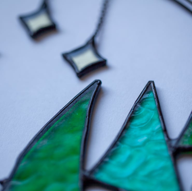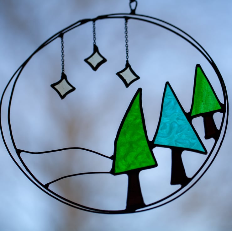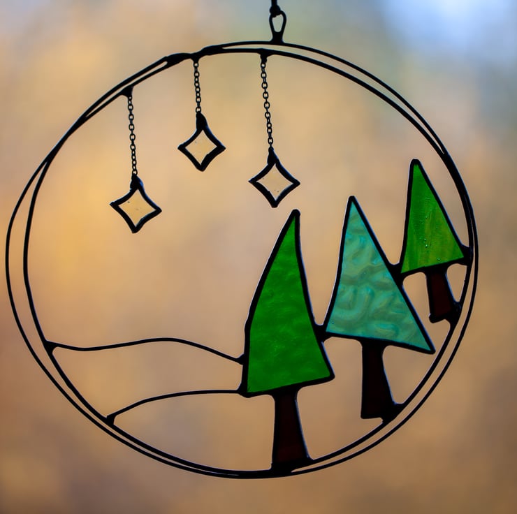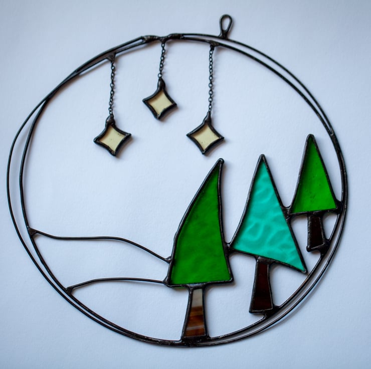 Miniature woods landscape, nice dangling three stars, handmade using stained glass, copper wire and chain. 18x18cm (HxW). Makes beautiful Christmas decoration but not only.