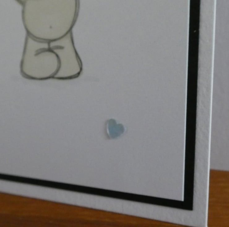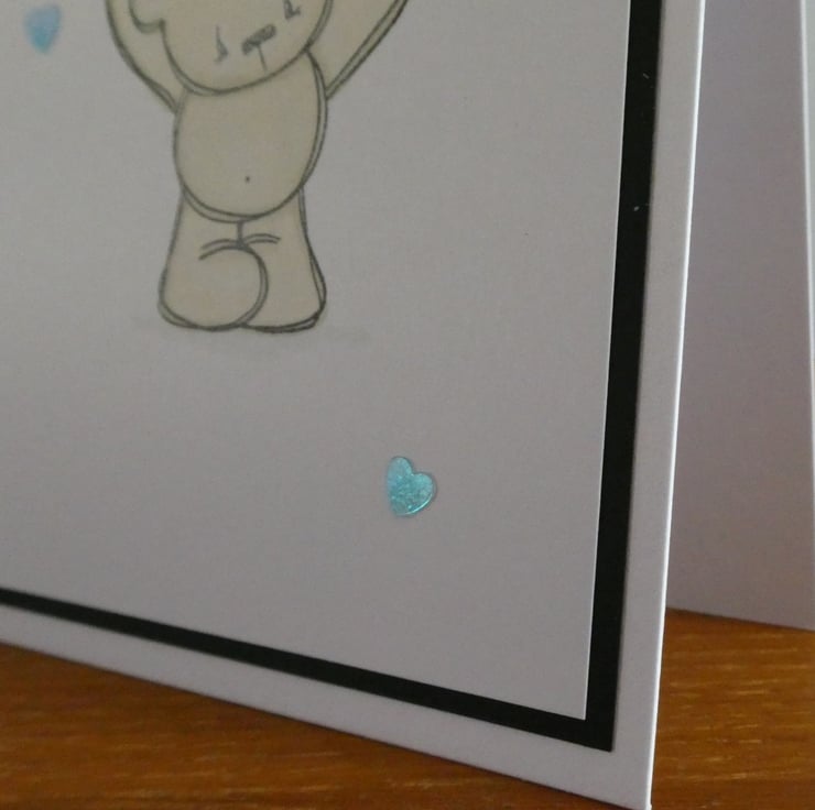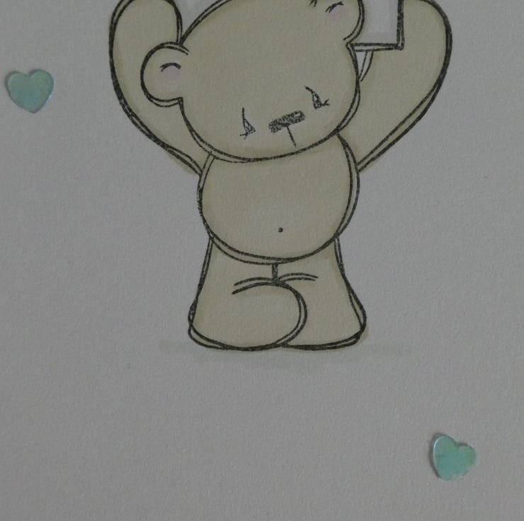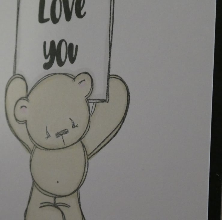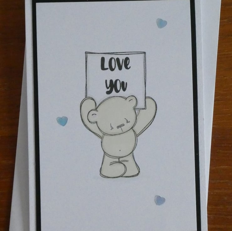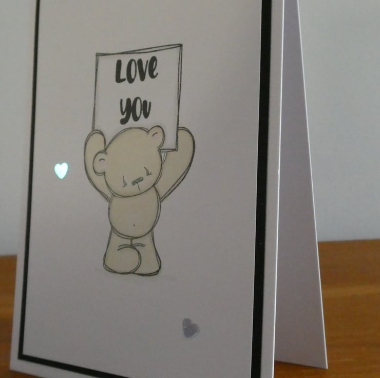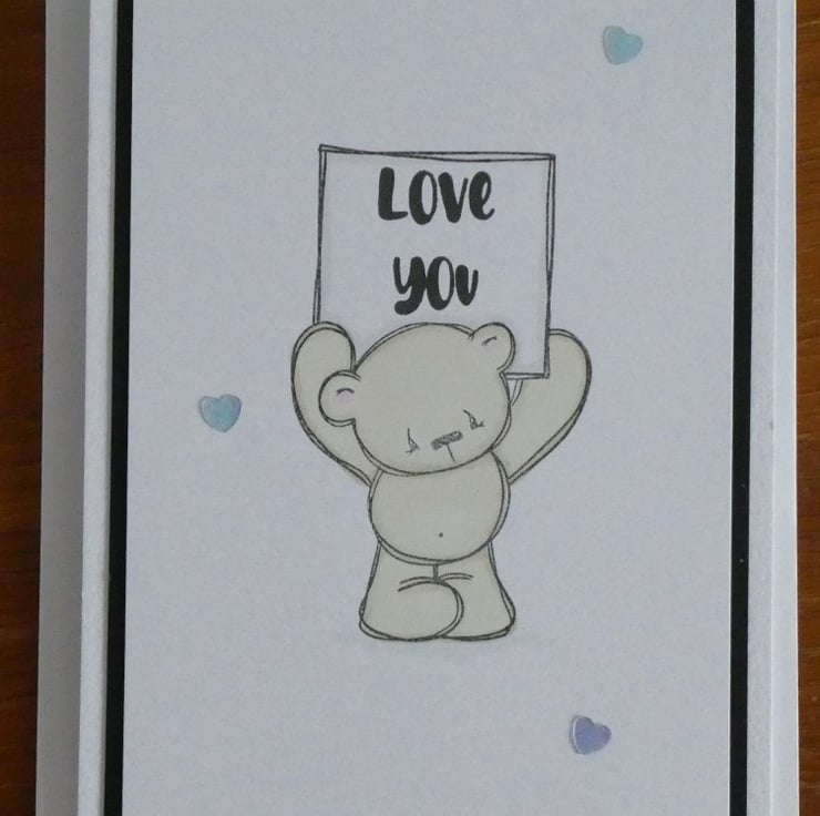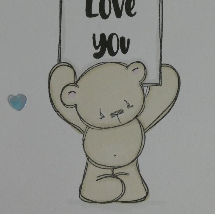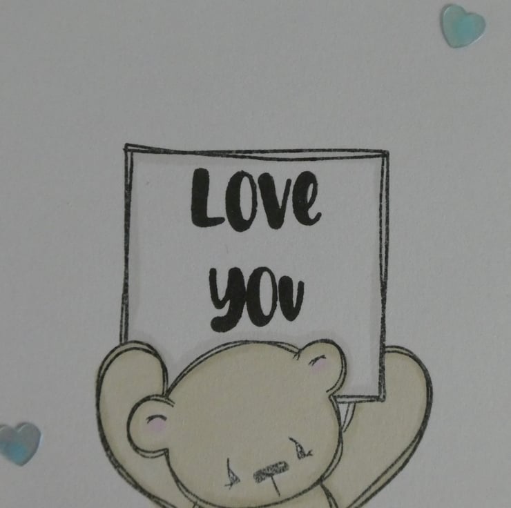 This card has been hand stamped with a cute bear, holding a sign above his head with the message Love You. It has been coloured in soft pastel beige and grey and finished with a scattering of sequin hearts.