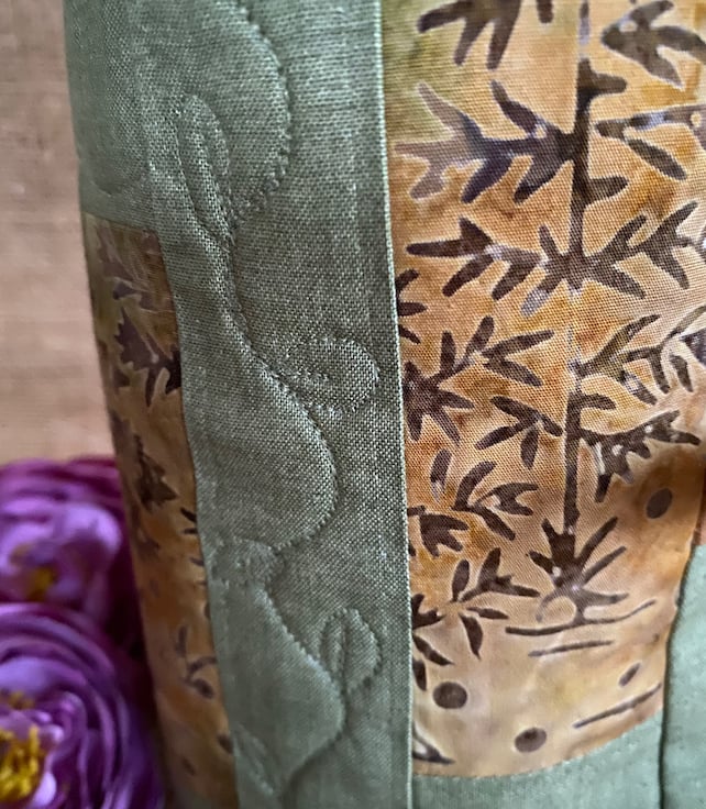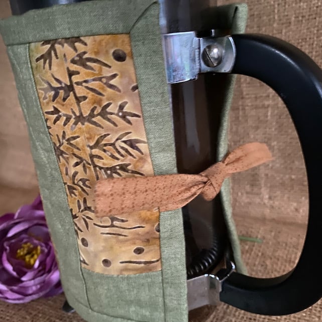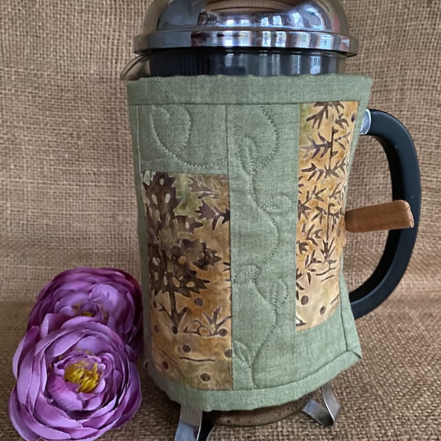 This tree themed, patchwork cover fits an 8 cup cafetiere. It has a quilting design of leaves and hearts on the panels and a tie fastening through the handle.