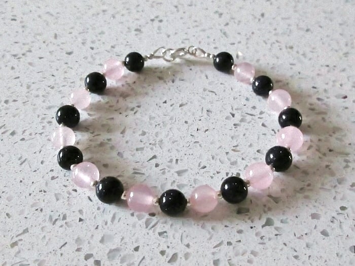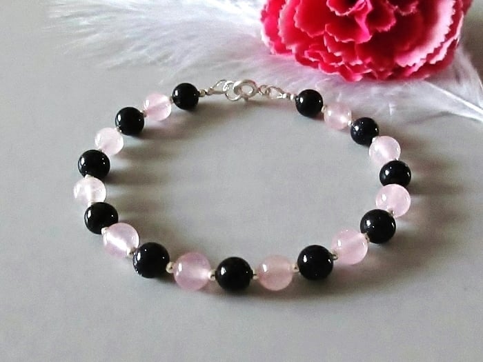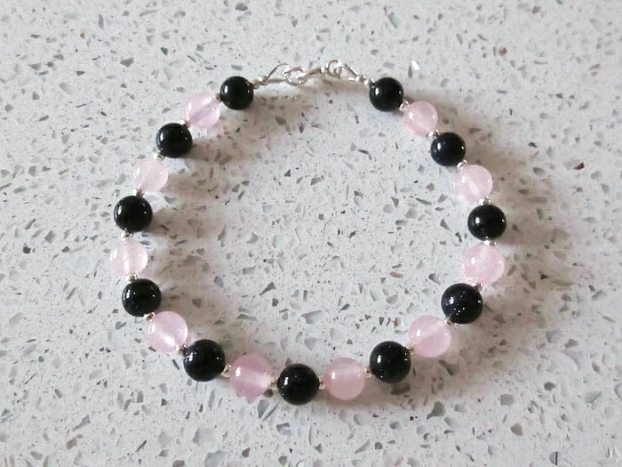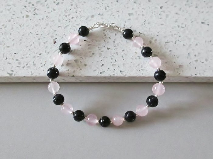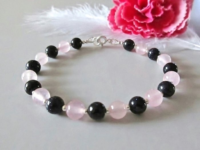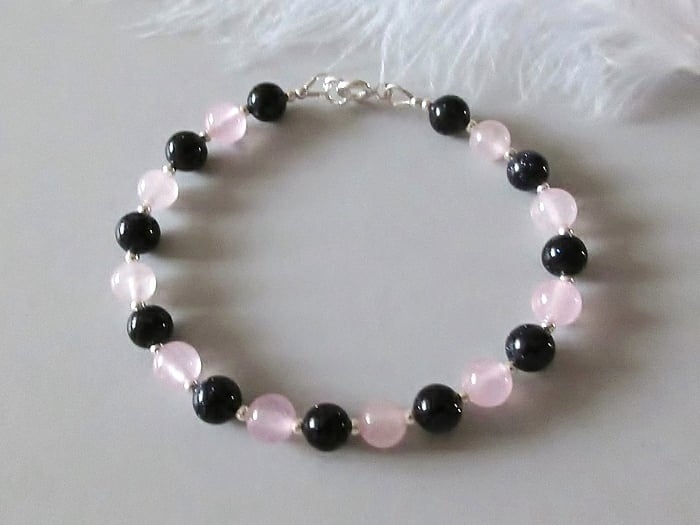 For this handmade bracelet I've used sparkly navy blue Goldstone & alternated them with romantic pink Rose Quartz. All of these beads are 6mm in size & between each one is a small Sterling Silver seamless bead.