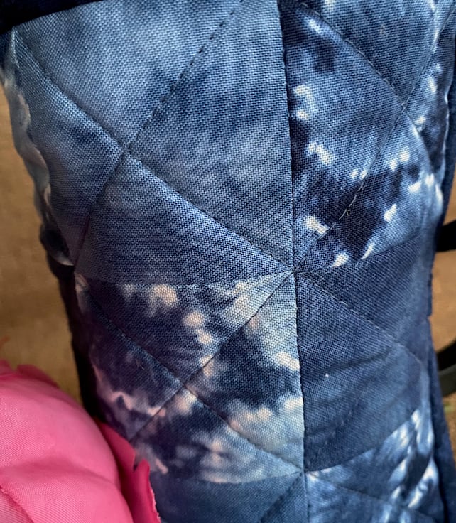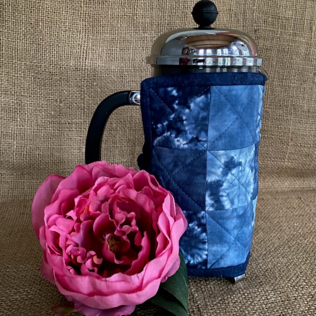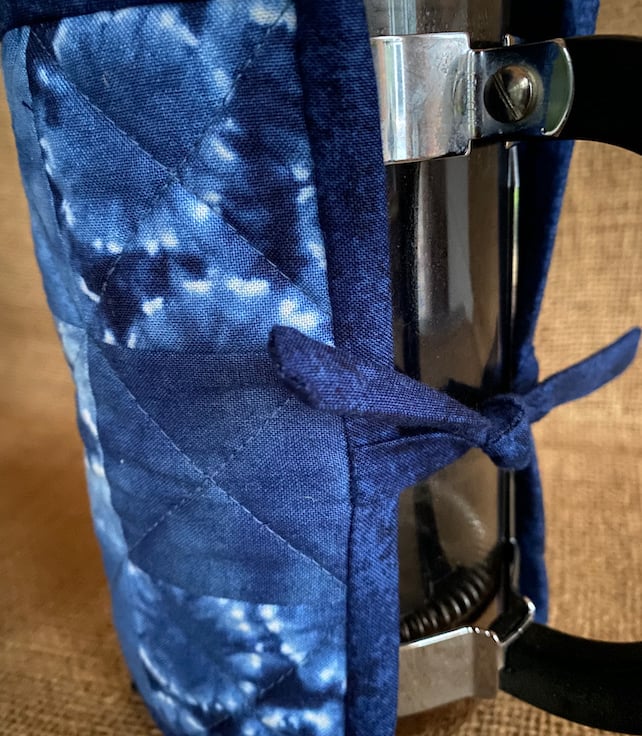 This blue themed batik cover fits an 8 cup cafetiere. The patchwork uses small squares of cobalt blue fabric, some plain and some with a circular splash style pattern. It is backed with navy blue with a criss-cross quilt pattern and a tie fastening through the handle.