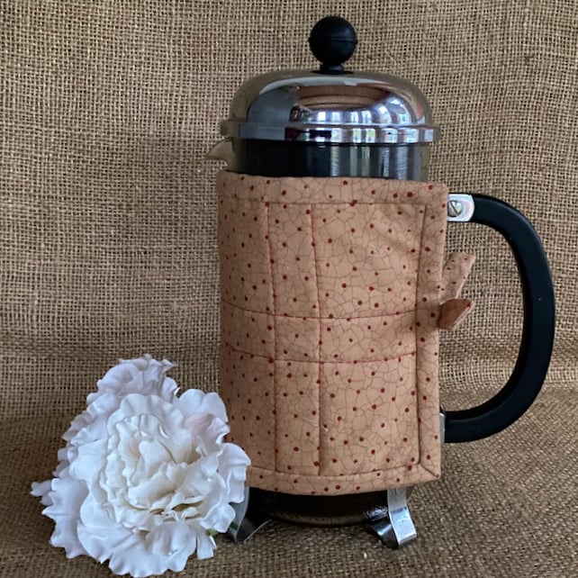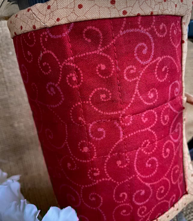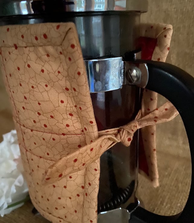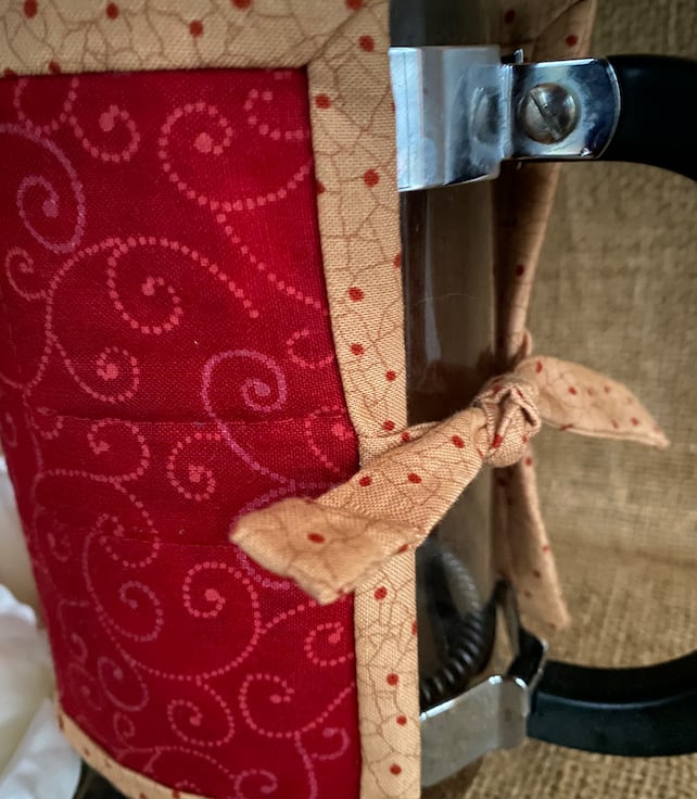 This double sided cover is designed to fit an 8 cup cafetiere. Made from red fabric with a swirling pattern and edged and lined with a contrasting beige fabric and the quilting in a coordinating (or contrasting on the reverse) red thread. It has a tie fastening through the handle.