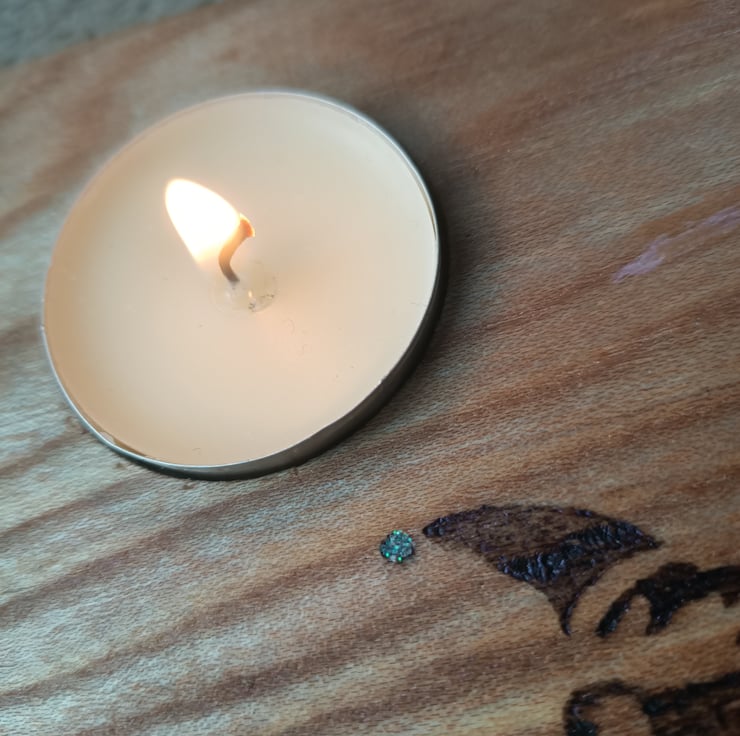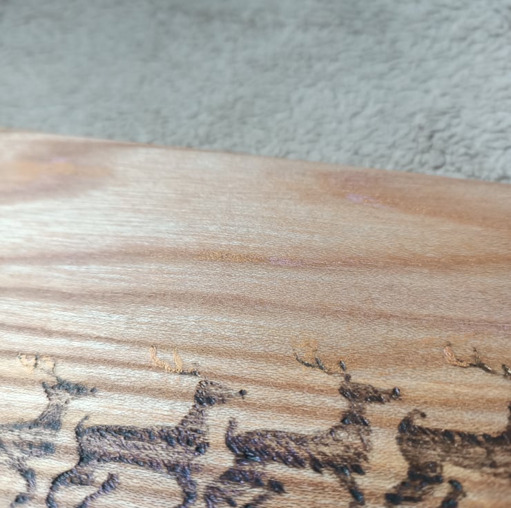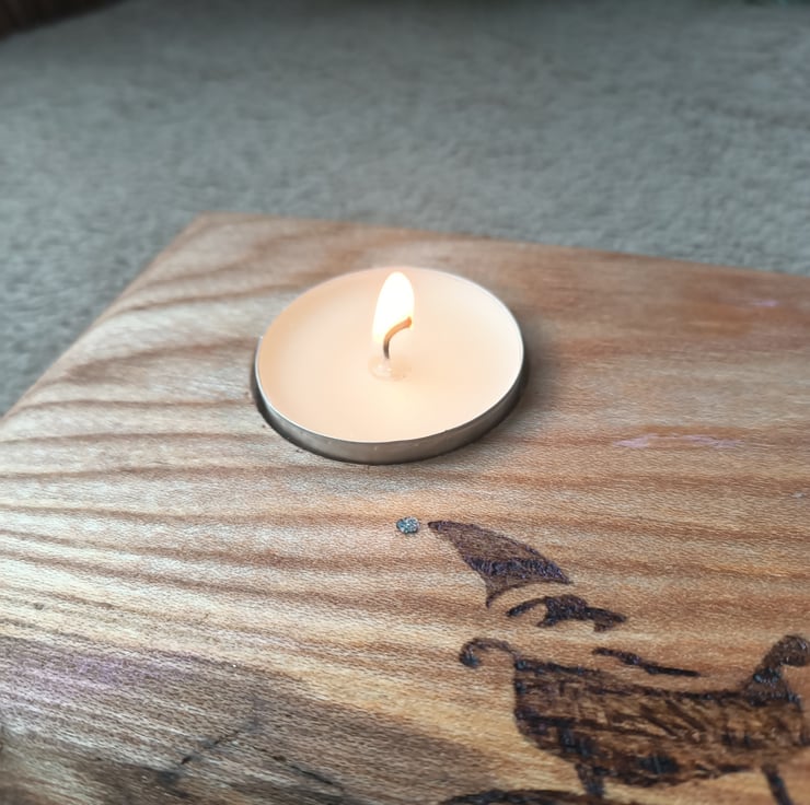 We have made space for one standard size tealight which when lit turns into the moon with santa and his sleigh fyling off into the niight, all hand pyrographed for a real handmade decoration. The reindeer have golden antlers and santas pompom is all sparkle.