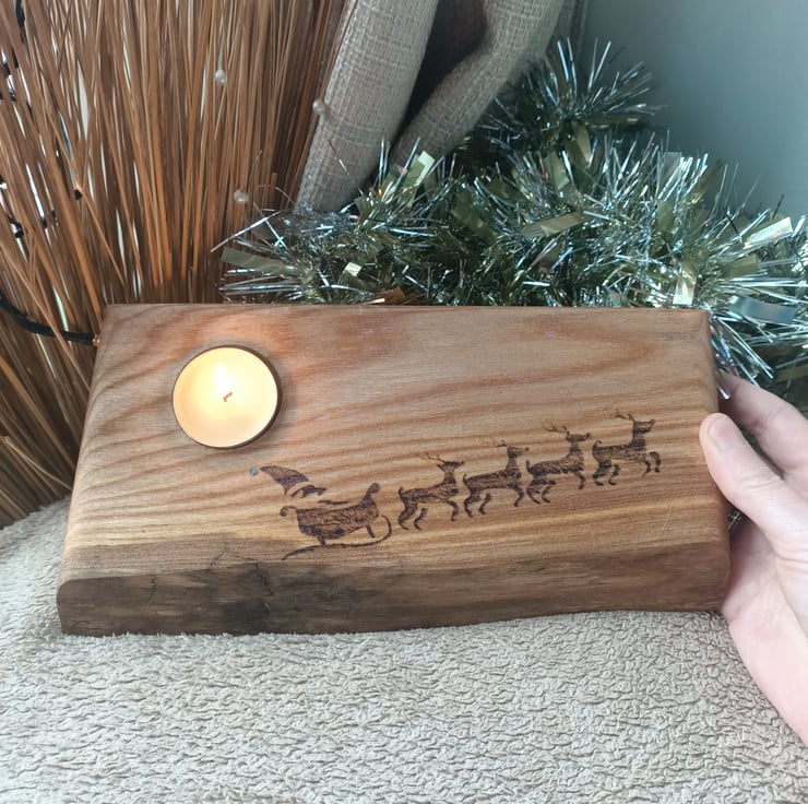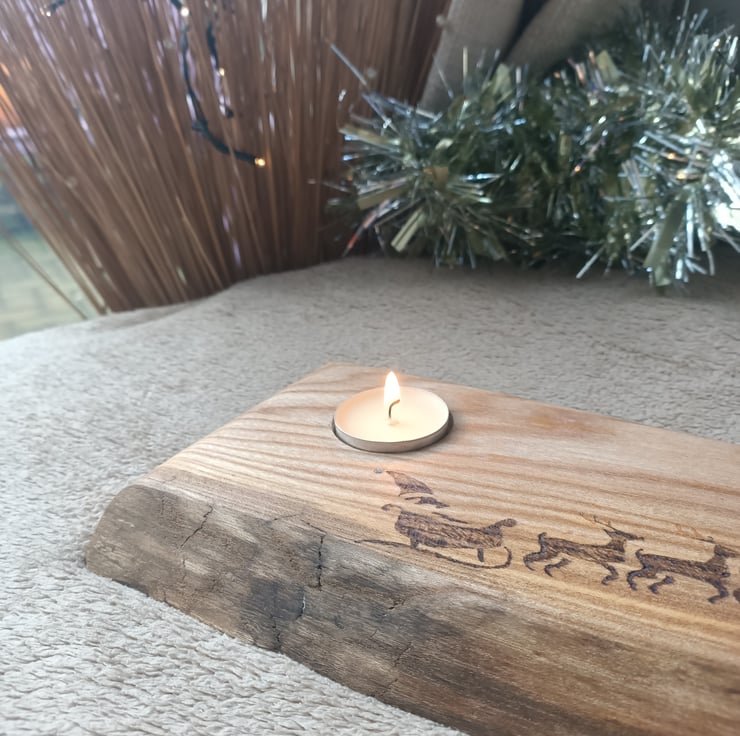 Santa sleigh reindeer wooden tealight holder moon sky live edge decoration.