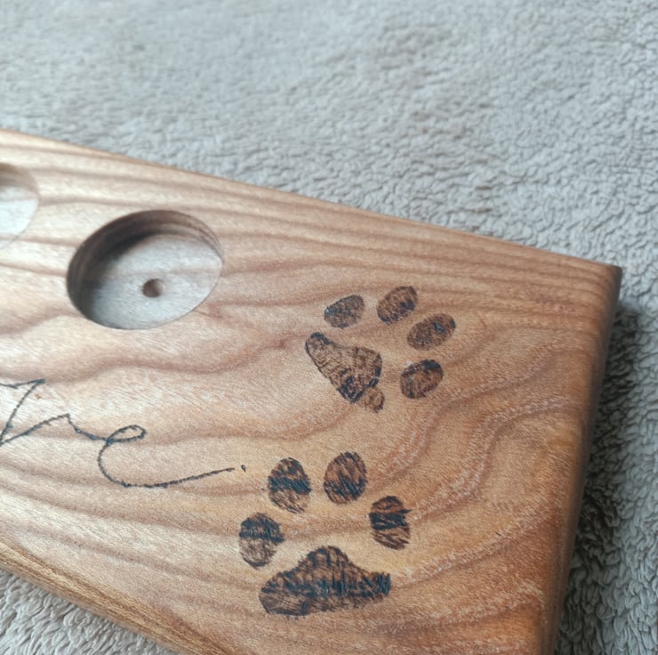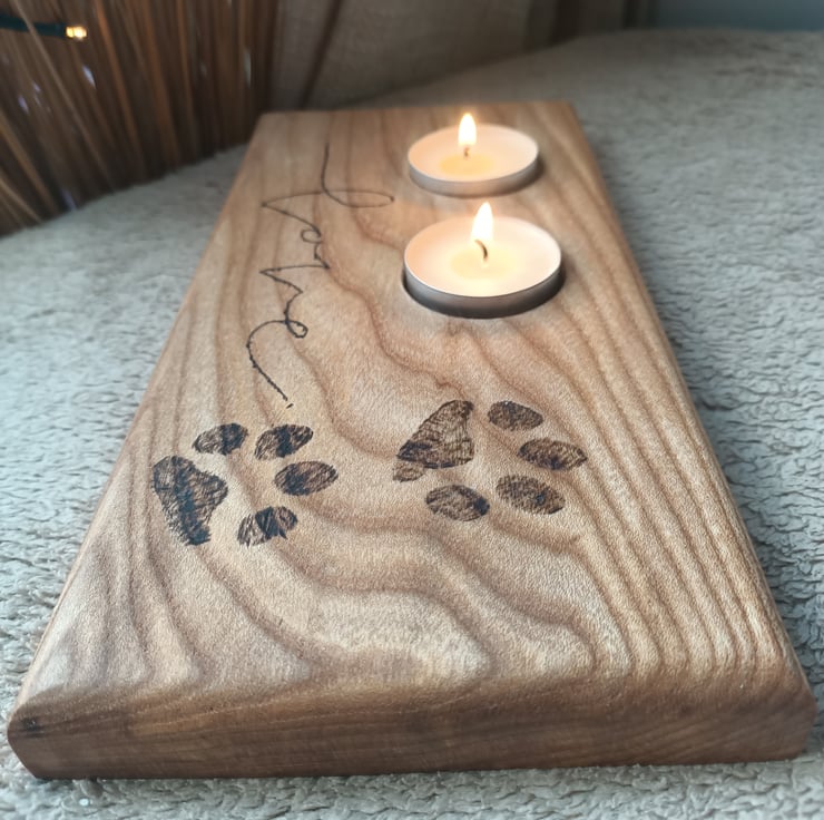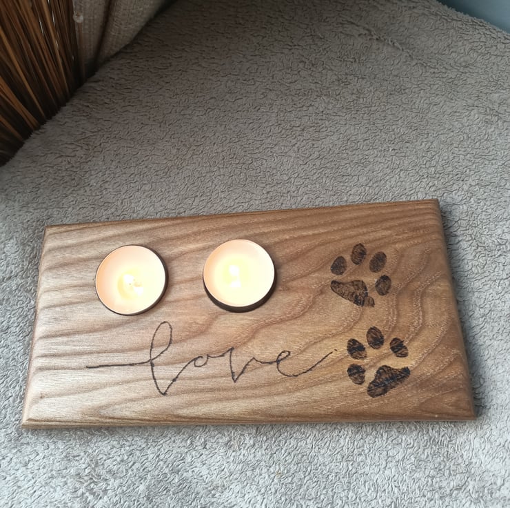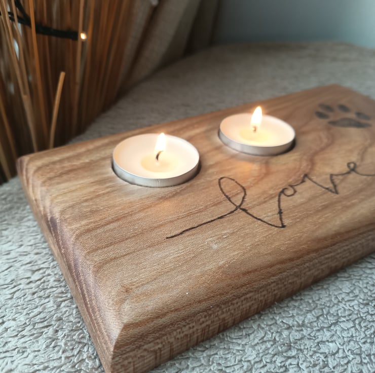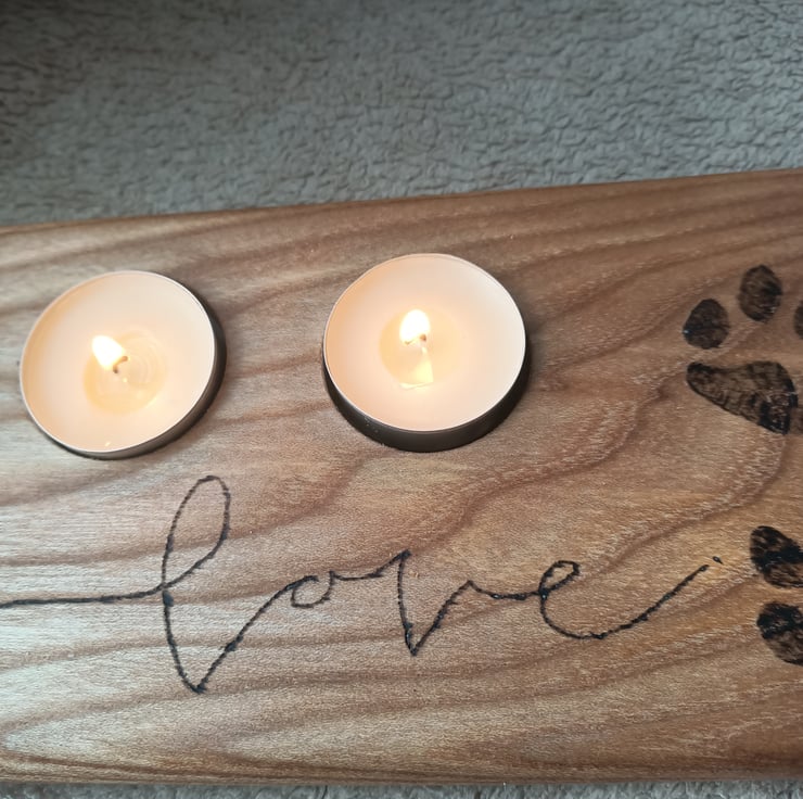 We have this beautiful wooden tealight candle holder with hand pyrography pawprints. The word love has also been pyrographed onto the holder. We have made space for 2 standard size tealights. It has been made from Elm wood which has beautiful natural grains.