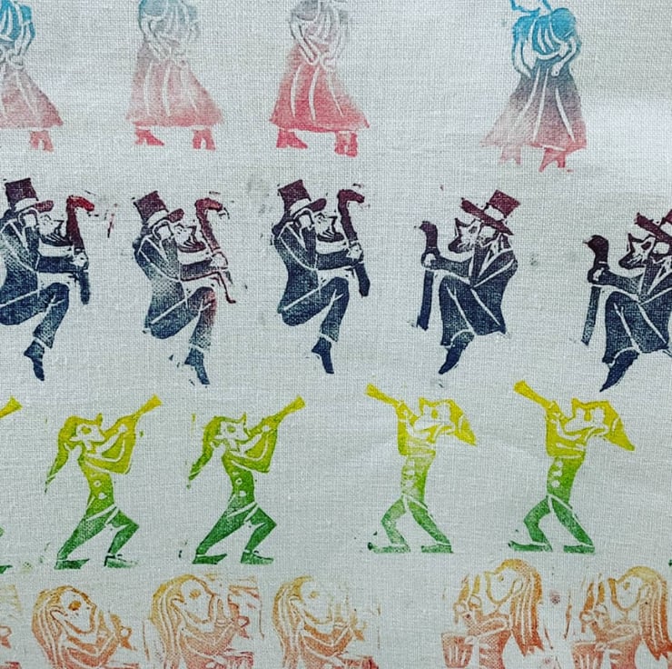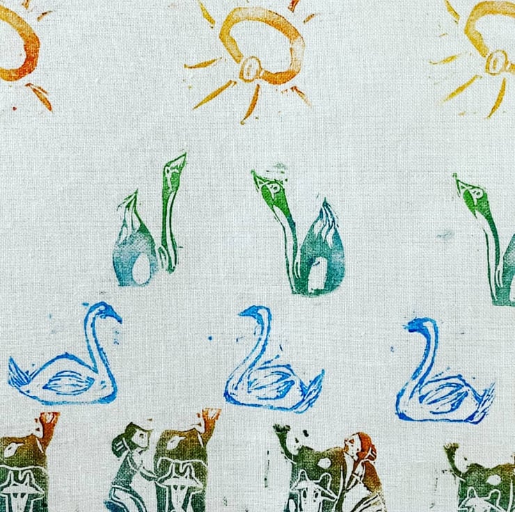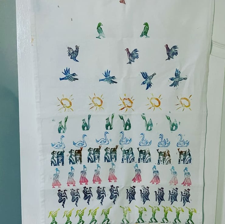 A large tea towel depicting images from the carol 12 days of Christmas.