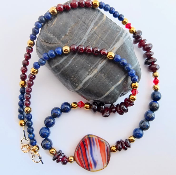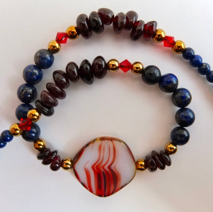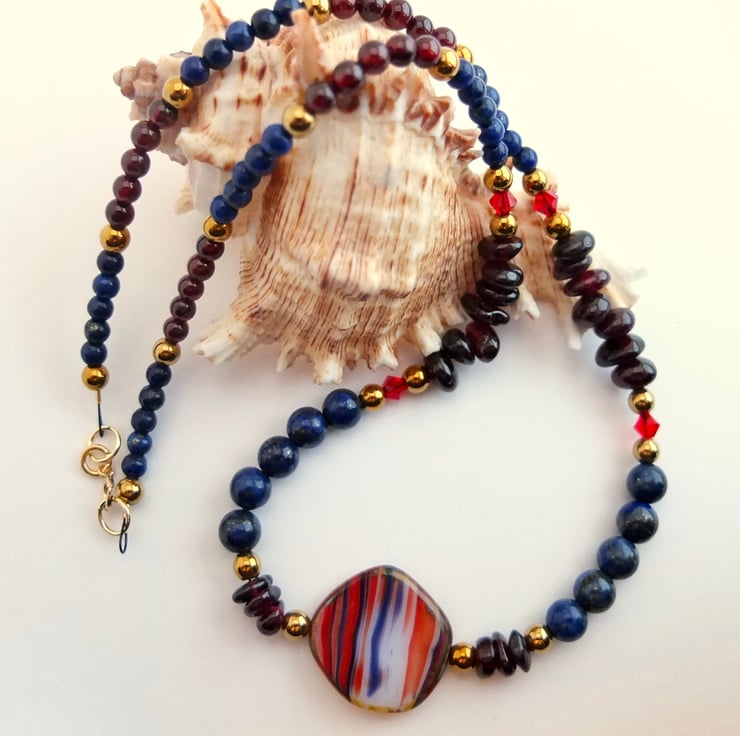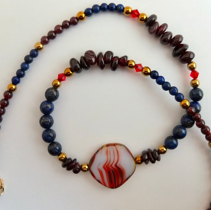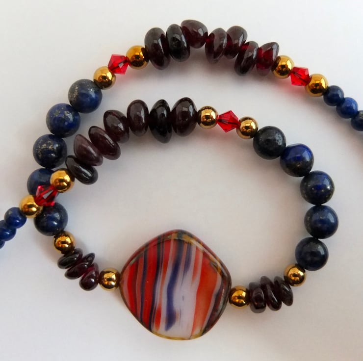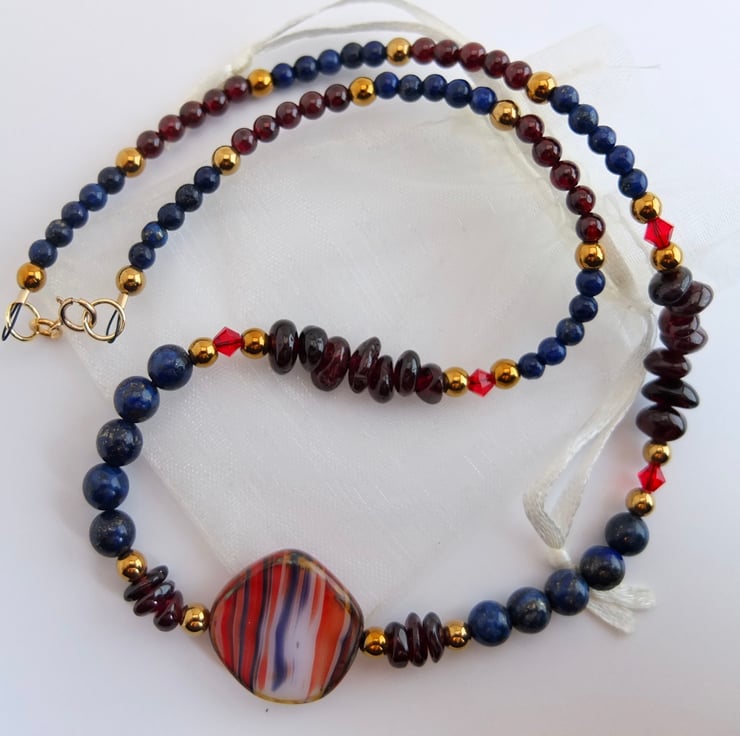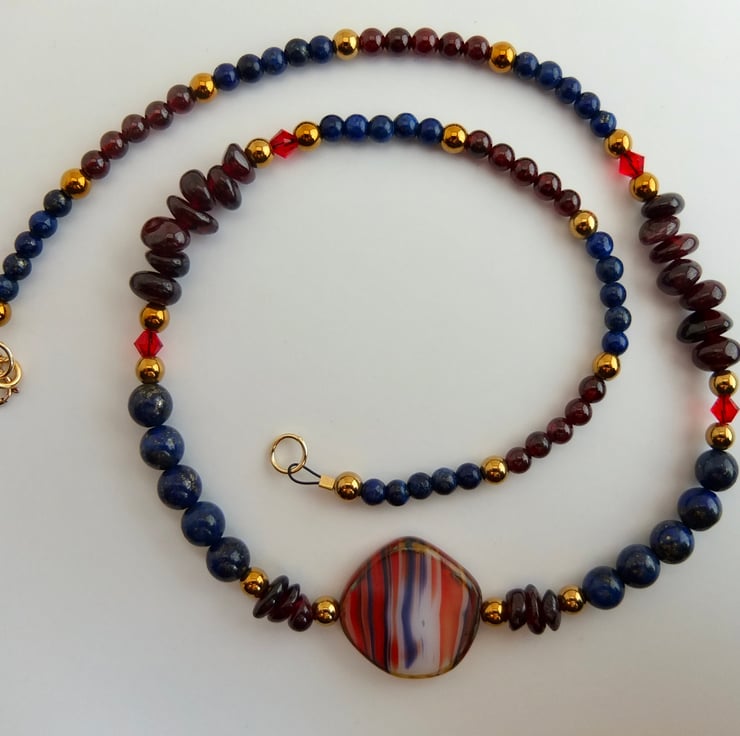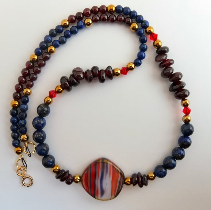 A Czech pressed glass coin bead forms the centre of this striking necklace of Garnet and Lapis Lazuli.