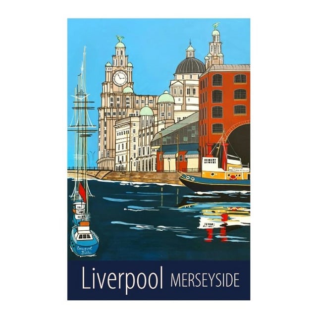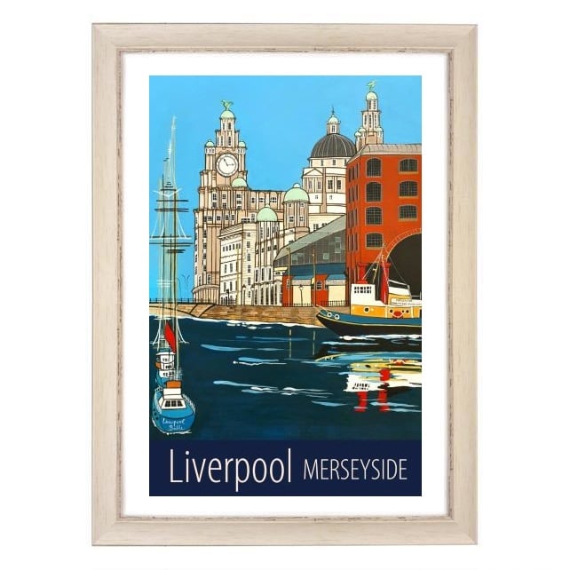 A contemporary travel poster style print of the view across Royal Albert Dock towards the Merseyside Maritime Museum and the Three Graces, in Liverpool, from my own original acrylic painting.