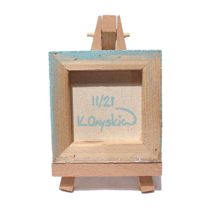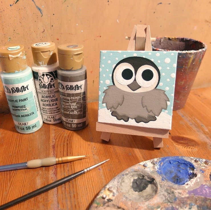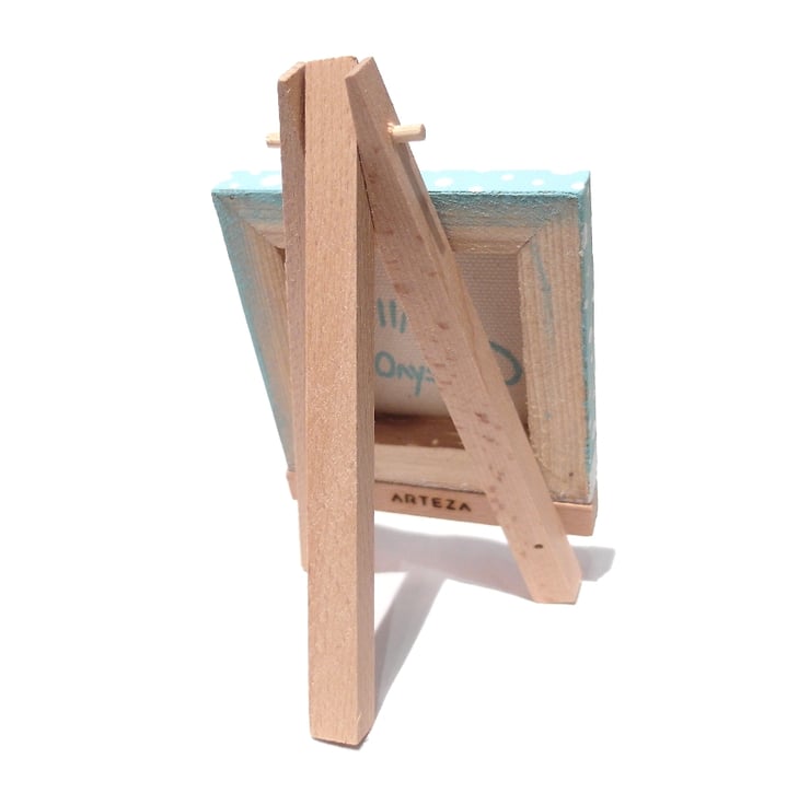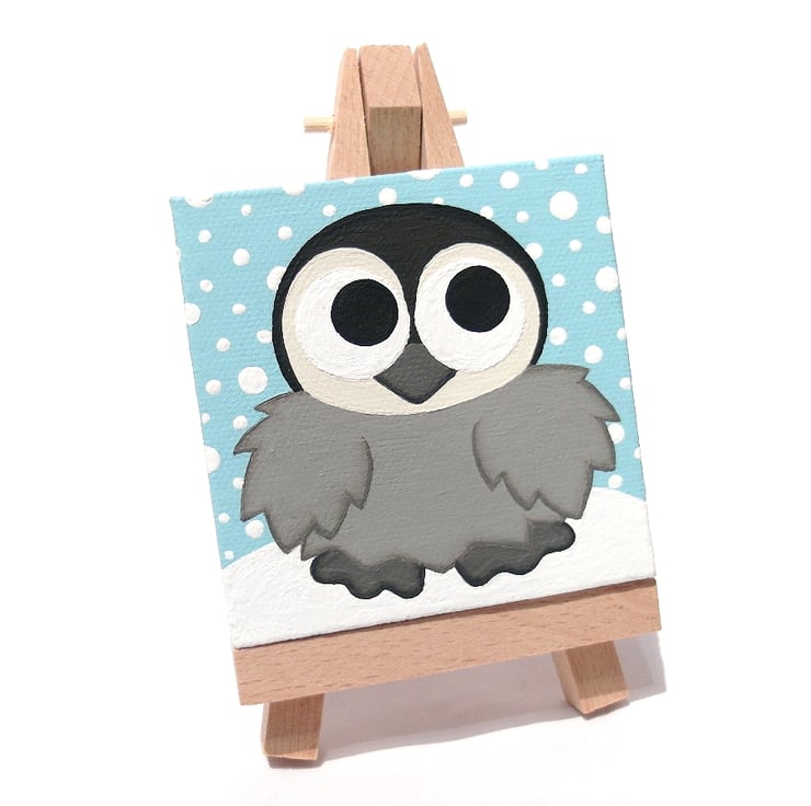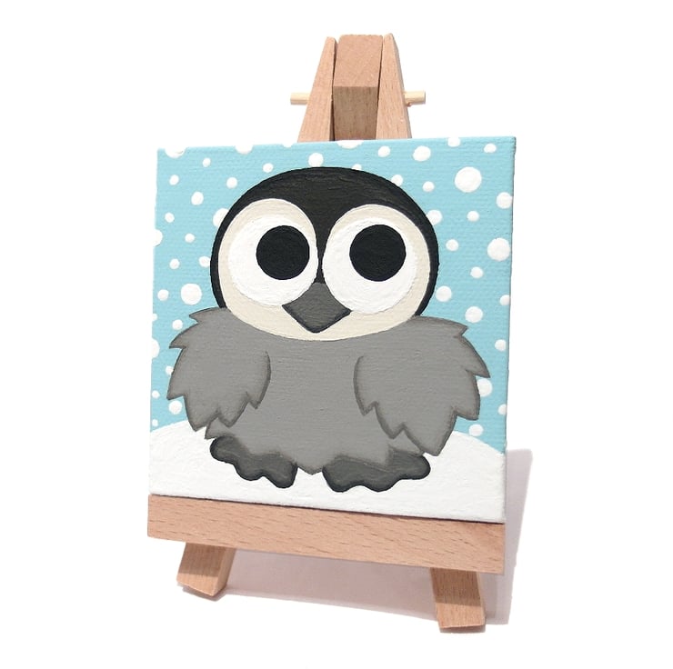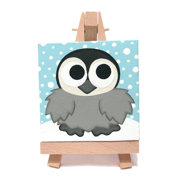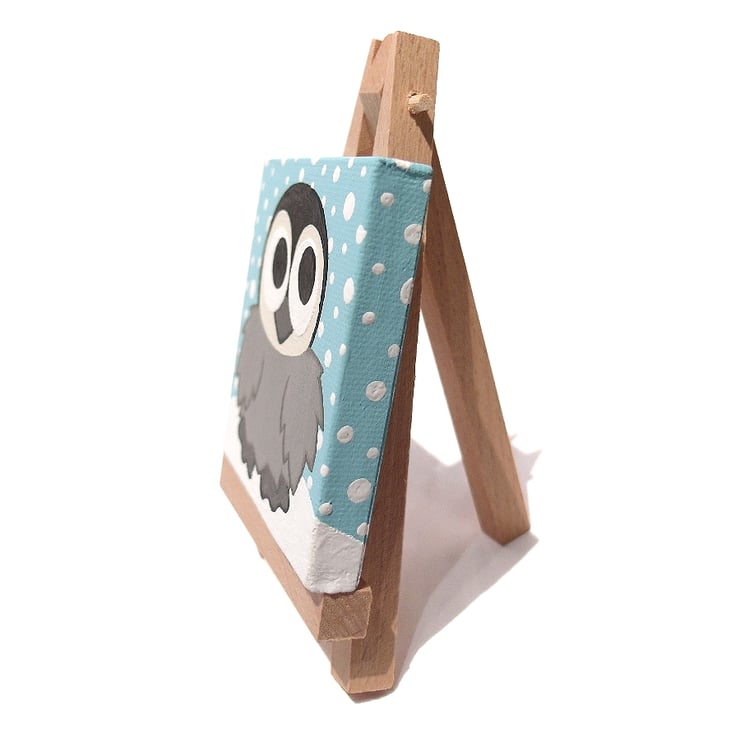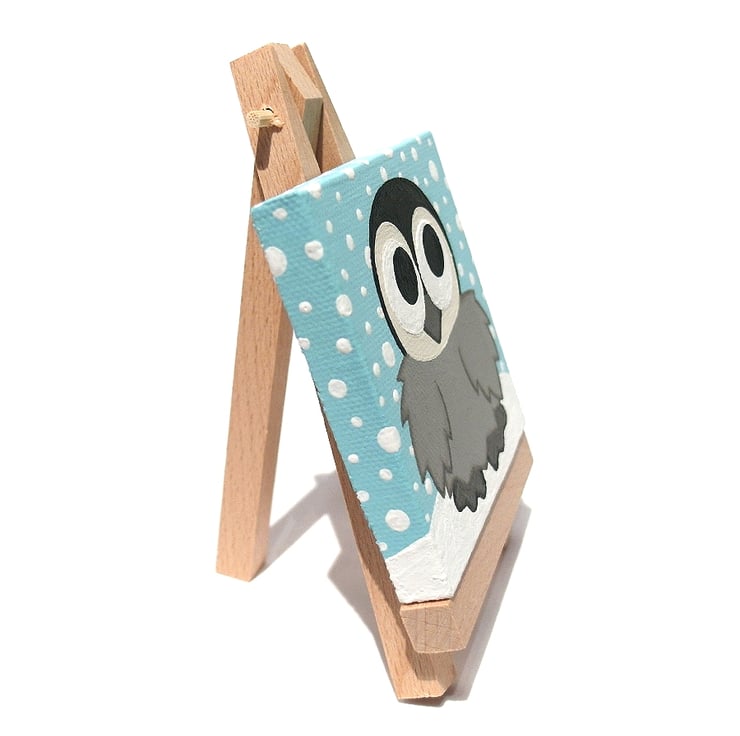 The penguin chick canvas will either come with a 12cm (4.7") wooden easel for display, or will be strung with a ribbon in a colour that matches the painting so it can be hung on a wall (as in the final photo). Just choose with easel or ribbon hanging when you buy.
