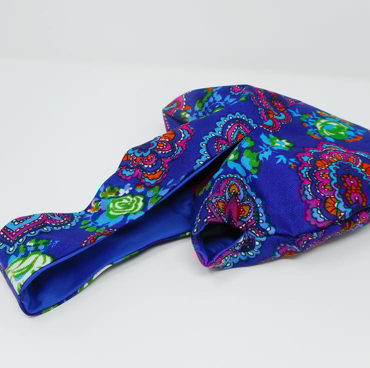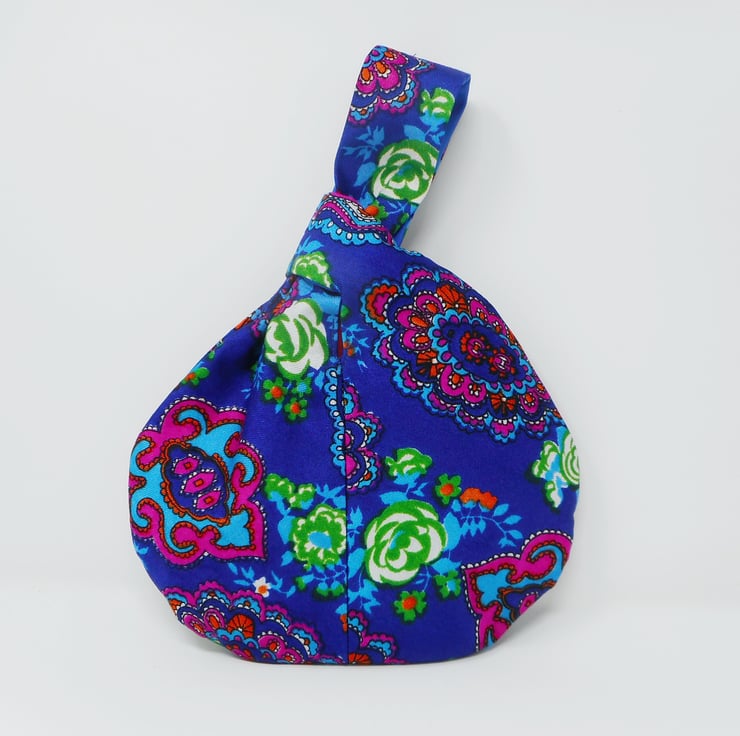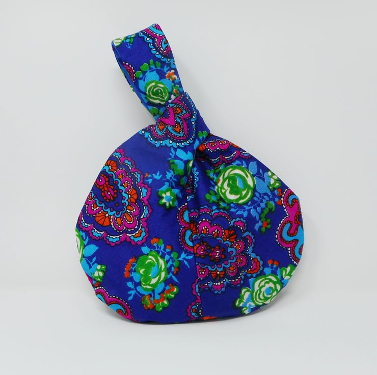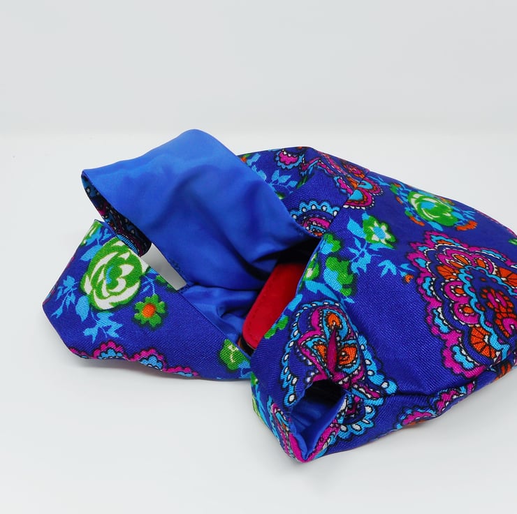 Flower Power is a Japanese knot bag in intensely coloured vintage fabric. The main fabric is printed in bright acid green, pink and orange on a background of purplish blue. The lining is a co-ordinating blue acetate satin.