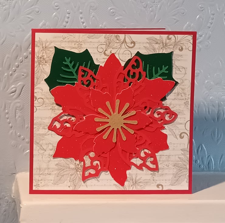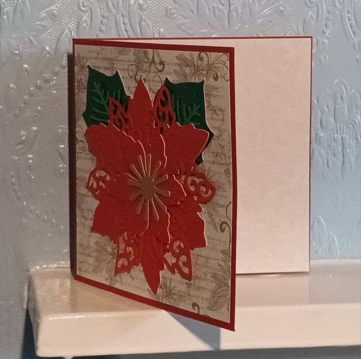 This pretty card features layers of poinsettia flowers and leaves on a background of neutral coloured poinsettia and musical scale paper.