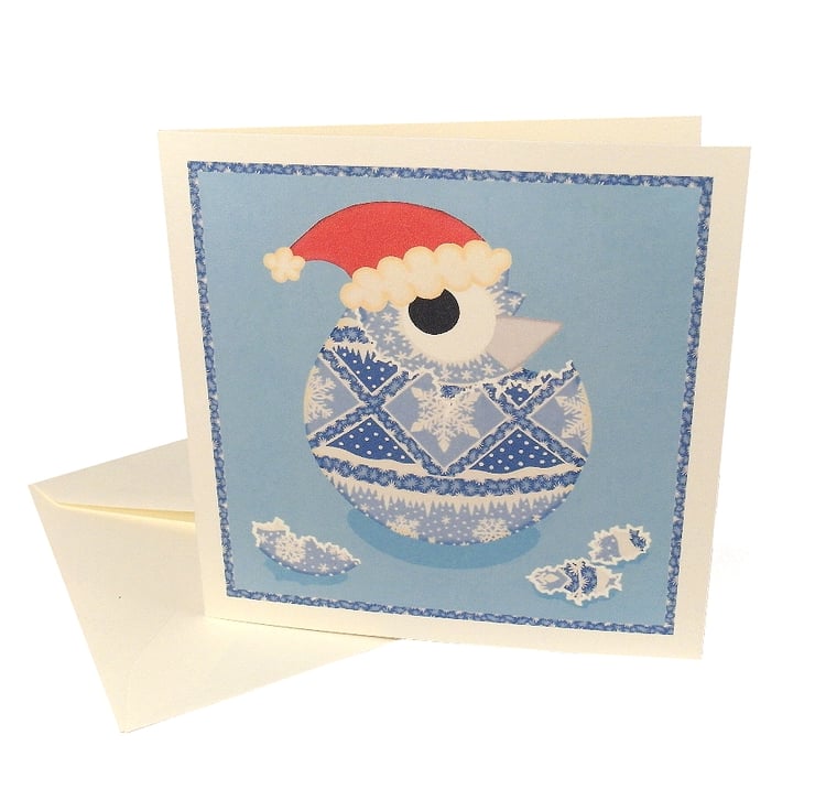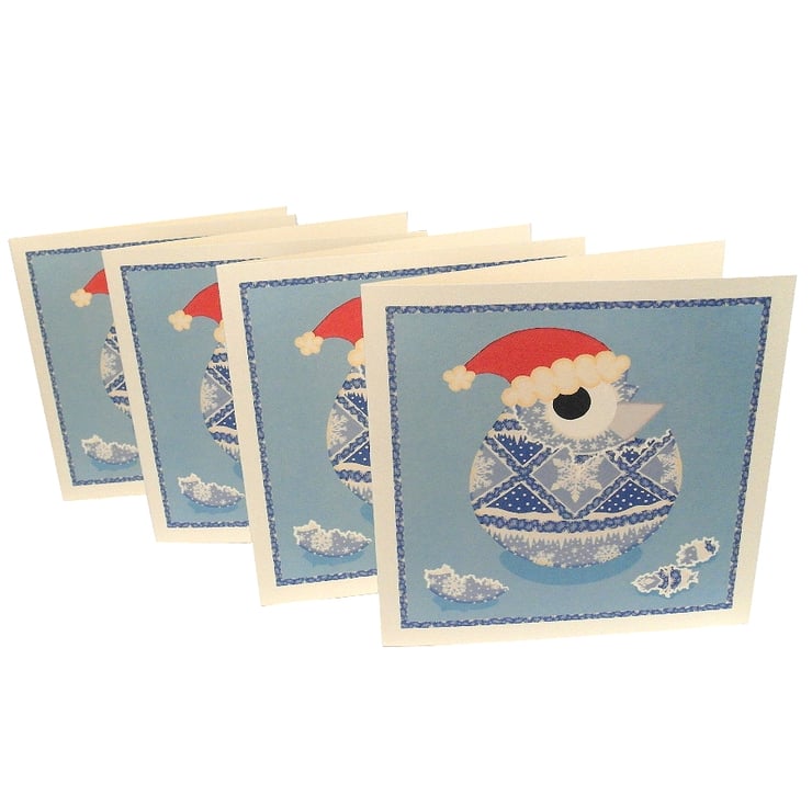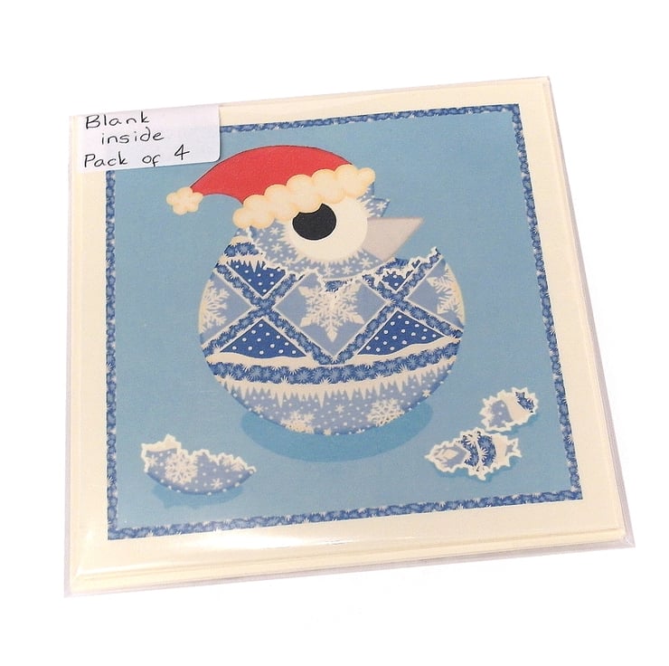A pack of 4 cards each featuring the same image - a cartoon chick in a santa hat hatching from a blue and white pysanka (a traditional Ukrainian decorated egg). The egg is decorated with snowy patterns and the chick has taken on the same design as the egg.