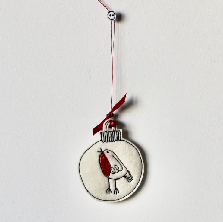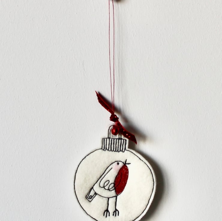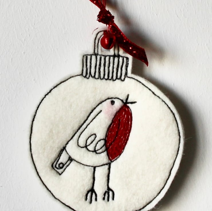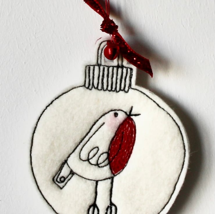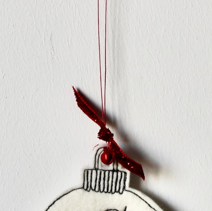 Wool felt baubles are created using 100% cream wool felt, glitter ribbon and free hand machine embroidery; each is cut out by hand, using a very sharp pair of scissors. There is ribbon and two bells to finish the bauble; with a linen thread to hang.
