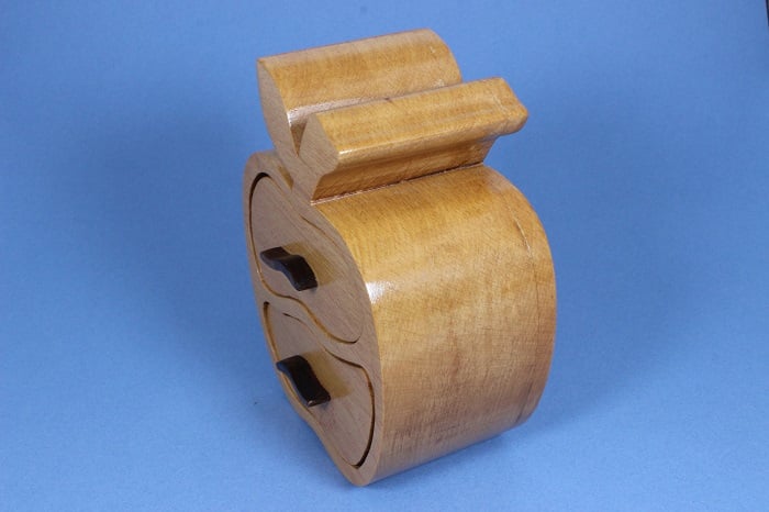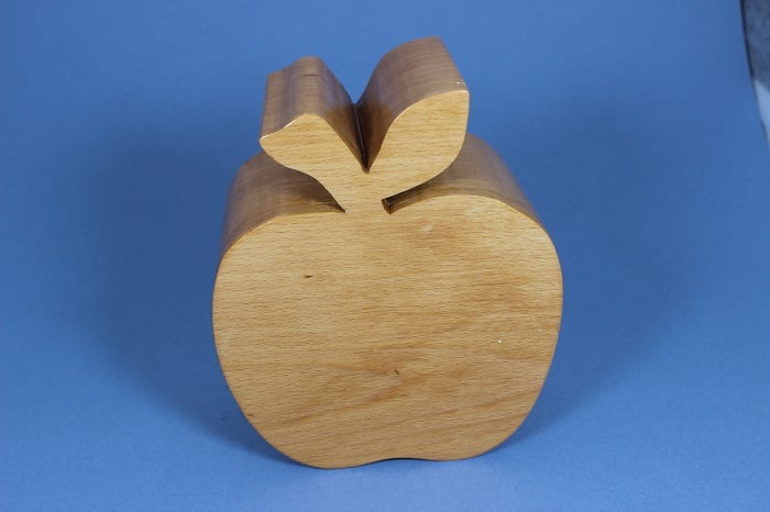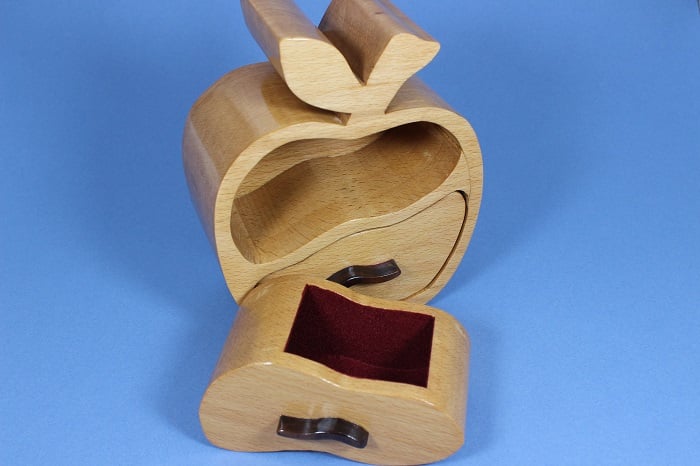 A distinctive jewellery box with two large draws designed as an apple. The box is made from beach wood with contrasting walnut draw handles. The box is finished to a light satin sheen, the draws are lined in contrasting cardinal red flocking.