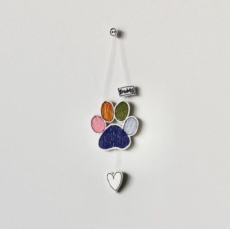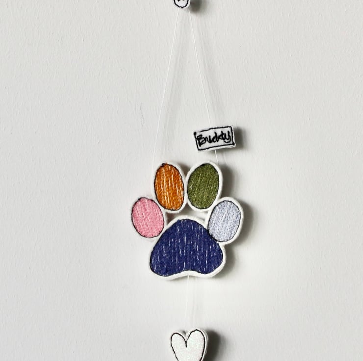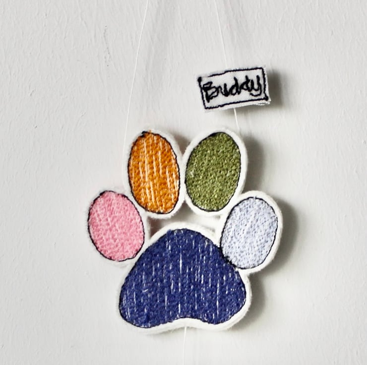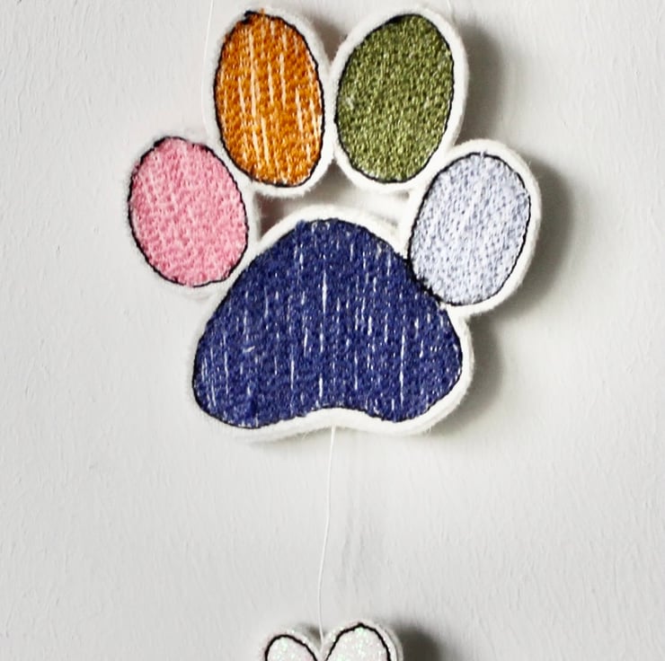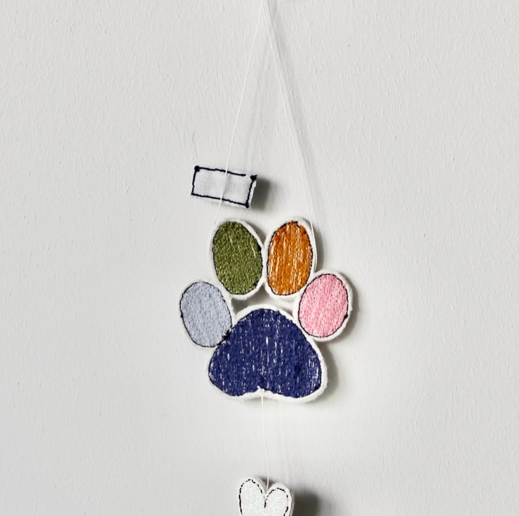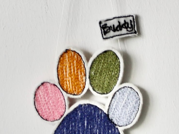 A handmade paw print in an array of stitched colour; a token to remember a loyal pet when they are no longer around.