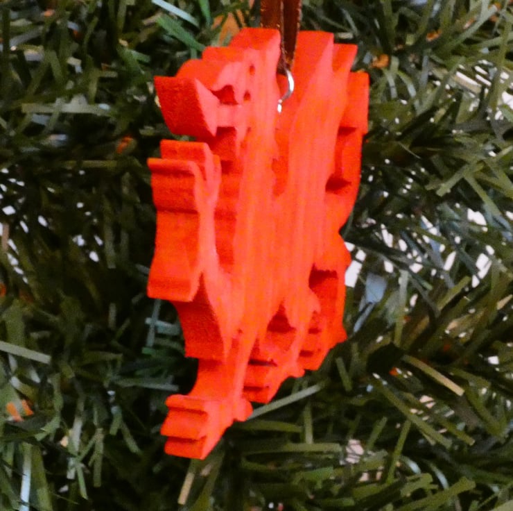 A piece of pine was selected and cut to accommodate the size of the decoration. The Dragon was cut using a scrollsaw following a design. Next I sanded it to a smooth finish, slightly rounding over the edges before painting it with red acrylic paint. It has been finished with Danish Oil to protect it. The Danish Oil is food and toy safe. A loop and ribbon were then attached to allow for hanging.