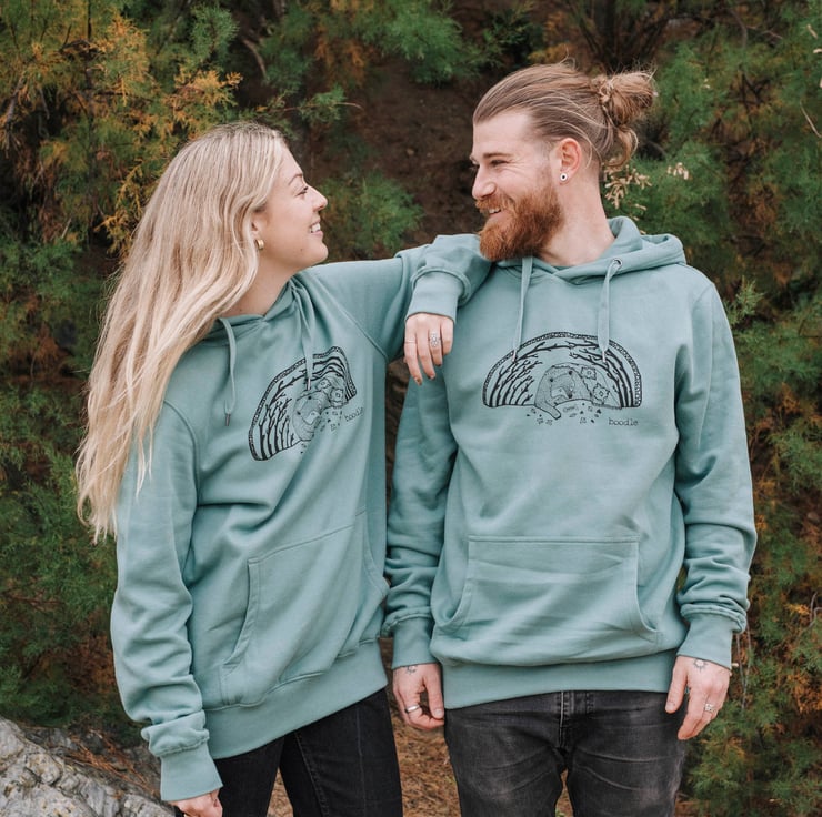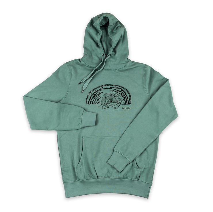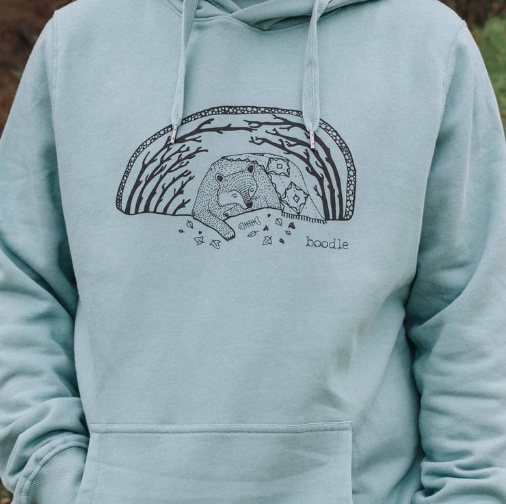 This lovely light teal green organic bear hibernating Hoody is perfect for those who like to have a snuggly warm winter! I love bears and think we need to remember to slow down sometimes and enjoy a slow pace of life in the winter. Featuring a beautiful illustration of a bear hibernating in its cave. This hoody is so snuggle and soft you will not want to take it off! Perfect for both Men and Women.