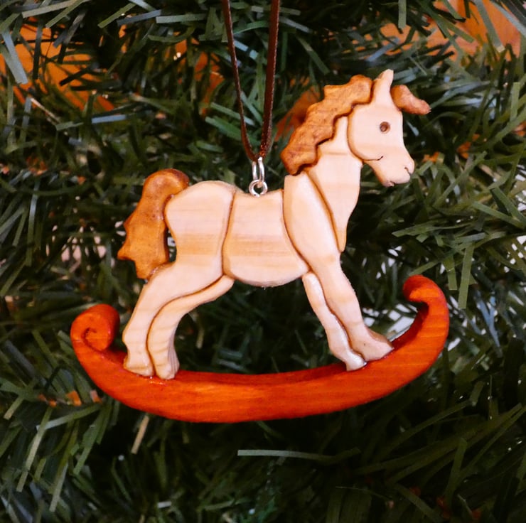 A piece of recycled wood was cleaned and sanded to enable me to upcycle it. The design was applied to the wood and cut using a Scroll Saw. The Intarsia woodworking technique was applied where different species of wood were cut and shaped into three dimensional pieces and then glued together to form a design. Some of the pieces were wood stained before being finished with Danish Oil, which is food and toy safe. To finish the decoration a loop and ribbon were added to allow for hanging.