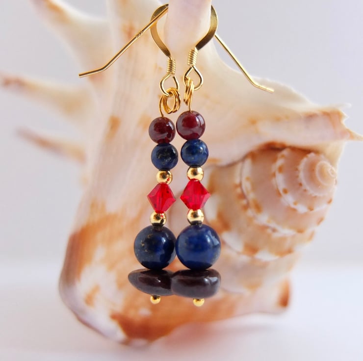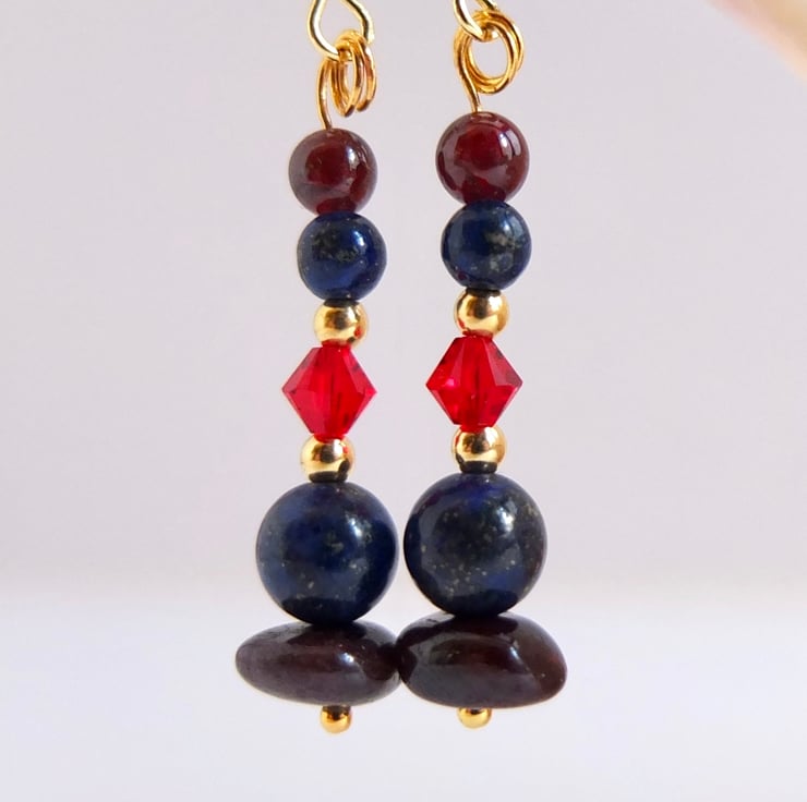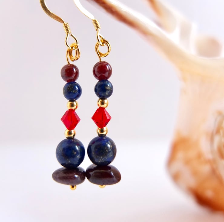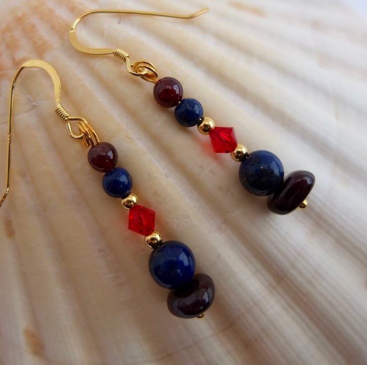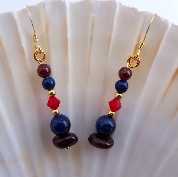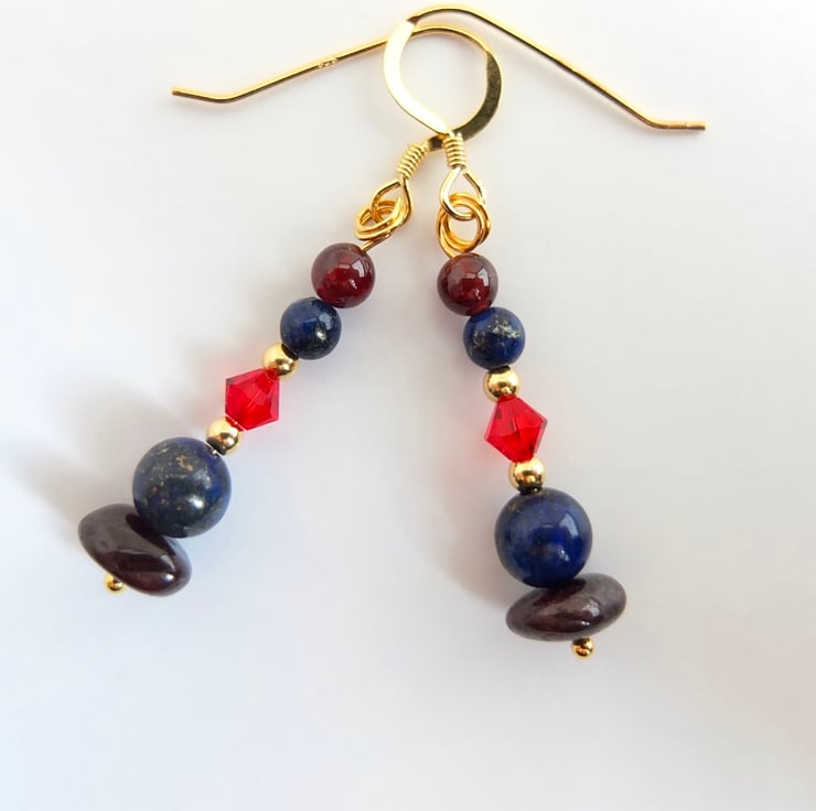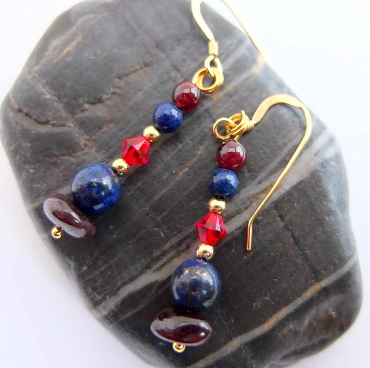 These drop earrings are comprised of garnet nuggets and 4mm round garnet beads, lapis lazuli 6mm and 4mm beads, sparkly red Swarovski crystals in a colour called "light Siam" and tiny gold vermeil rounds.