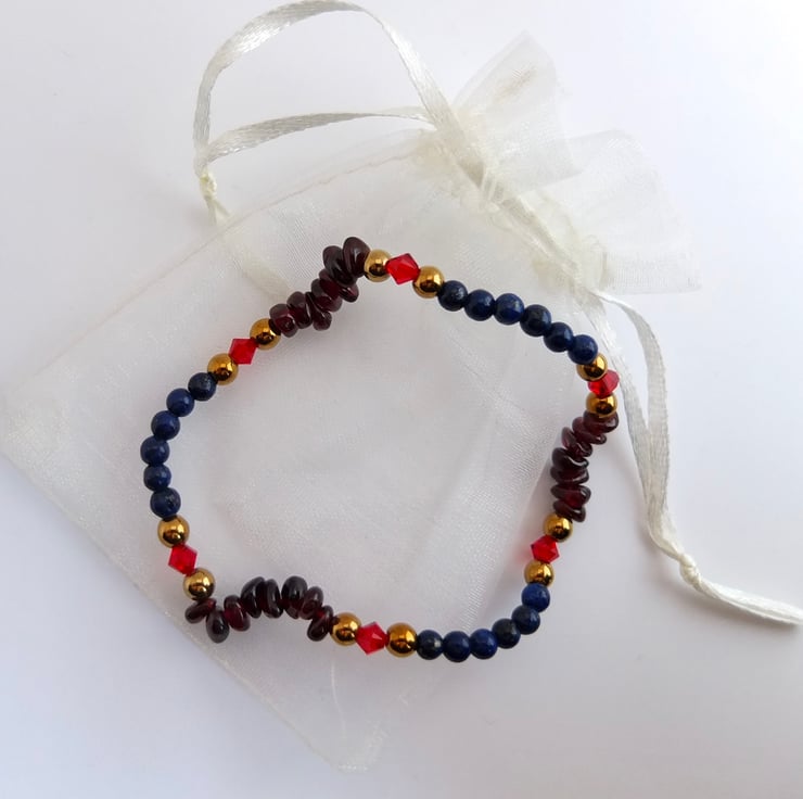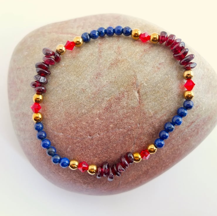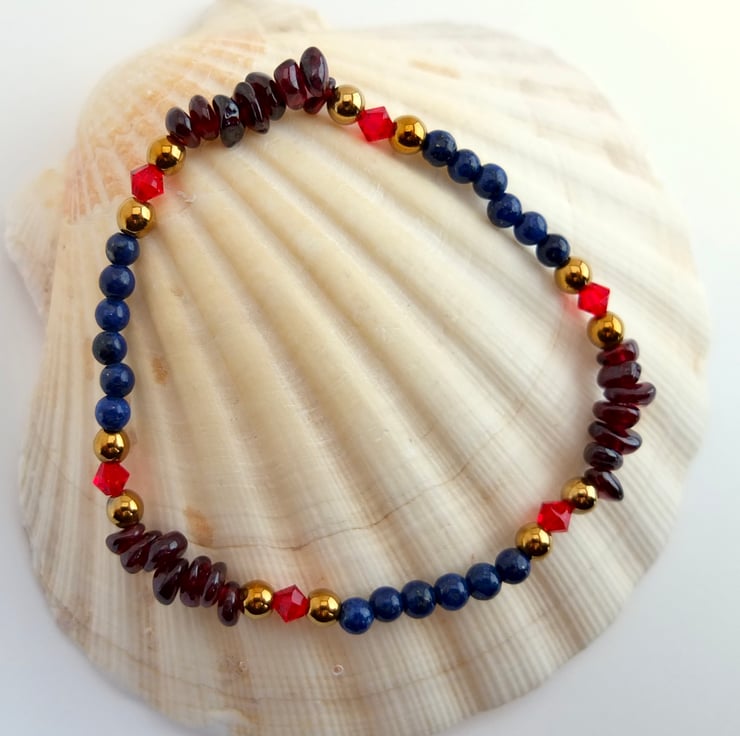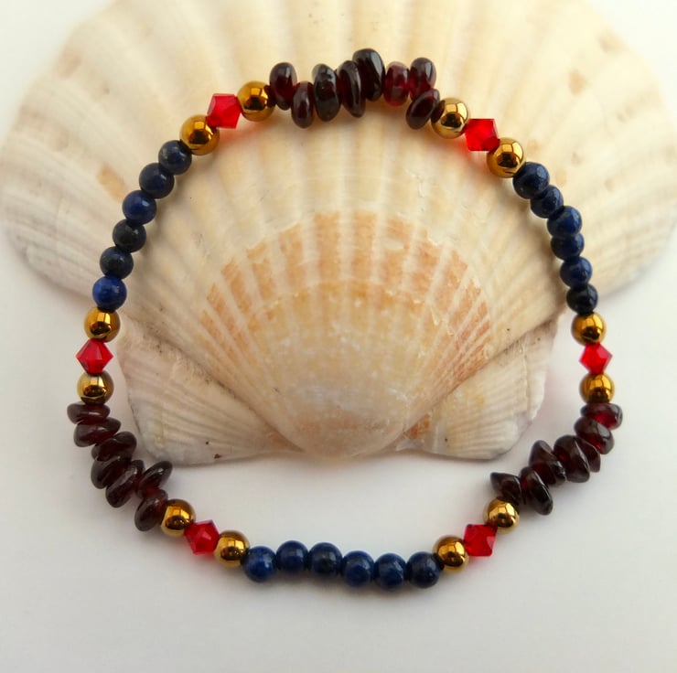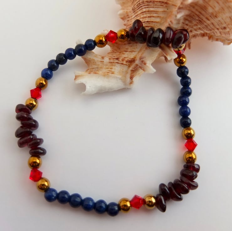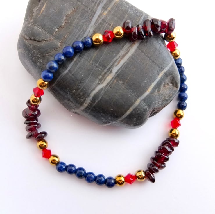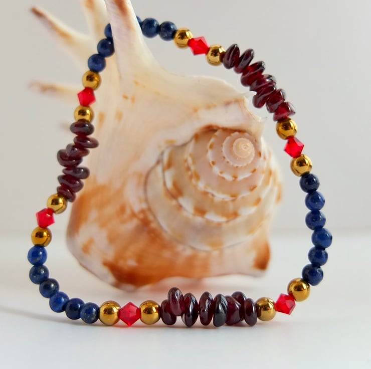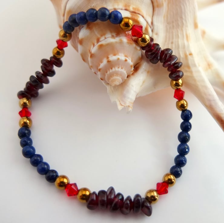 Polished, semi-translucent garnet chips and 4mm lapis lazuli beads are separated by sparkly red Swarovski crystal bicones in a colour called "light siam" and golden hematite rounds.