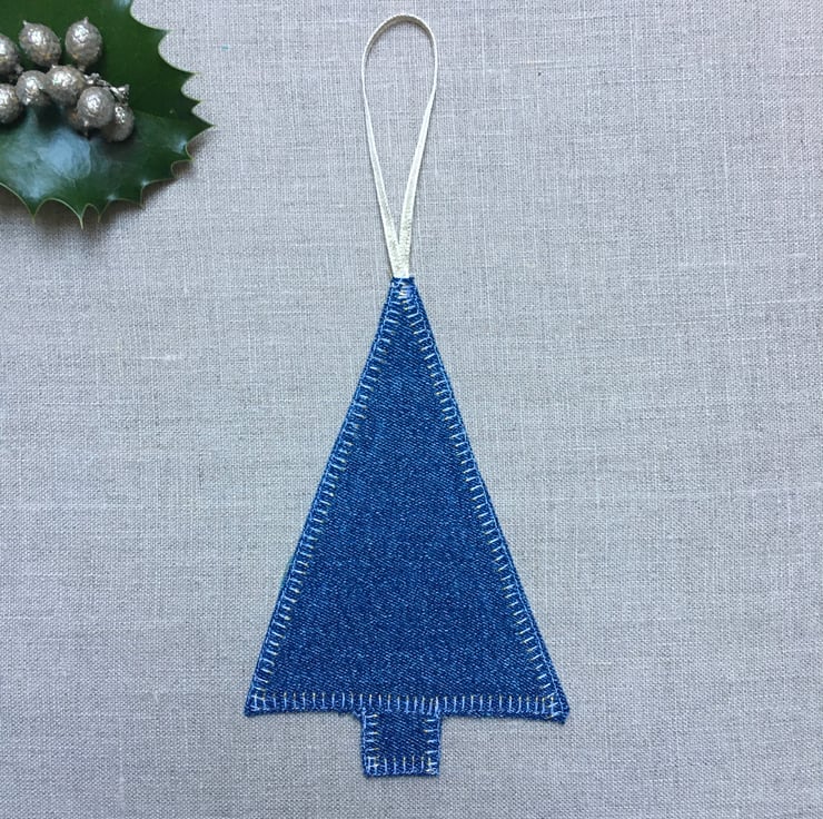 Each tree is unique as I use up left-over fabric. It is stitched with metallic gold Japanese thread on the front. The backing is an up-cycled pair of jeans so as to create a minimal wastage decoration.