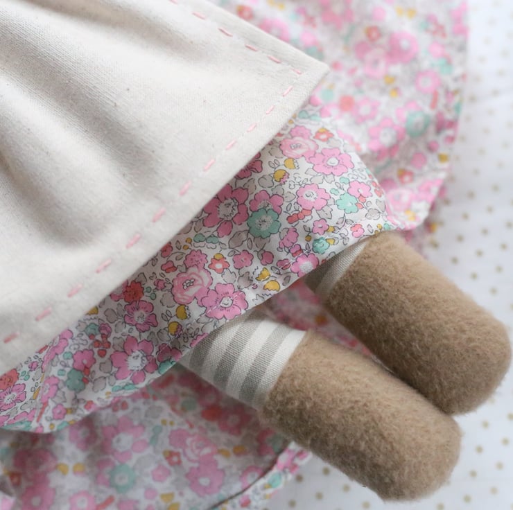 She is wearing a removeable dress made from beautiful Liberty of London fabric in Betsy Ann pale pink with a little Peter Pan collar. Her body is constructed from wool/cashmere mix fabric and she has stripy cotton legs.