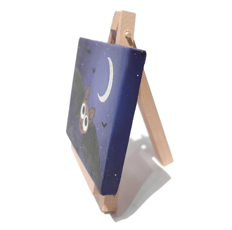 An original miniature canvas painting of a cute bat flying through a starry night sky, looking at the crescent moon. The silhouette of other bats can be seen flying in the distance of the dark blue sky.