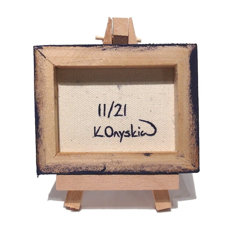 This cartoon bat is painted in acrylics on an 8cm x 10cm (3.2" x 4") mini canvas and is signed and dated on the back. The small size makes this good to display on narrow surfaces such as a mantel, windowsill or shelf, or to brighten a desk with some cute animal art.