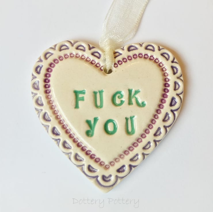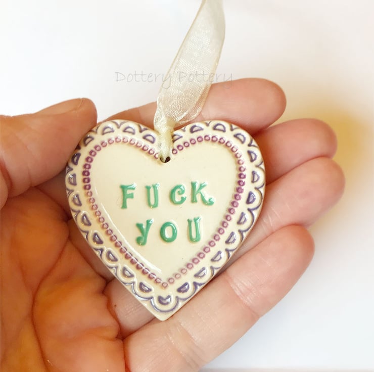 This little heart is made from white earthenware clay, imprinted with the words FUCK YOU (I have asterixed them out in the photo but the words are fully readable on the pottery) The perfect gift to let someone know how much you love them! It has been fired twice, once to the bisque stage and then a second firing for the clear glaze. It measures 4.5 centimetres wide x 5cm height x 5mm thick. It can be hung outside.