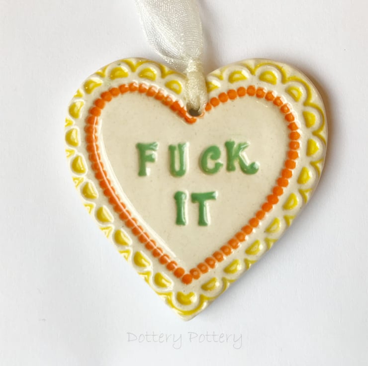 This little heart is made from white earthenware clay, imprinted with the words FUCK IT (I have asterixed them out in the photo but the words are fully readable on the pottery) The perfect gift to let someone know how much you love them! It has been fired twice, once to the bisque stage and then a second firing for the clear glaze. It measures 4.5 centimetres wide x 5cm height x 5mm thick. It can be hung outside.