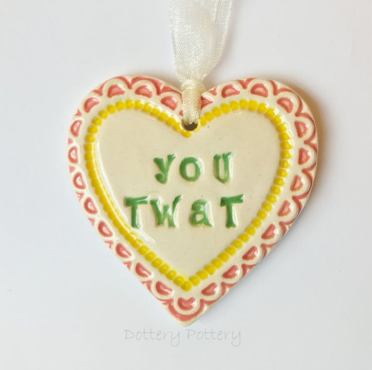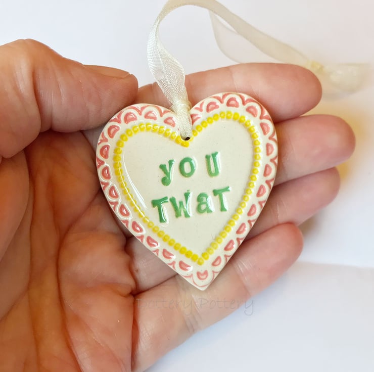 This little heart is made from white earthenware clay, imprinted with the words YOU TWAT (I have asterixed them out in the photo but the words are fully readable on the pottery) The perfect gift to let someone know how much you love them! It has been fired twice, once to the bisque stage and then a second firing for the clear glaze. It measures 4.5 centimetres wide x 5cm height x 5mm thick. It can be hung outside.