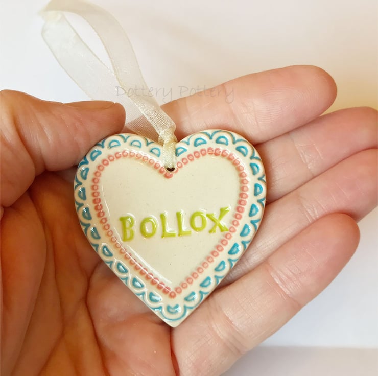 This little heart is made from white earthenware clay, imprinted with the words BOLLOX. The perfect gift to let someone know how much you love them! It has been fired twice, once to the bisque stage and then a second firing for the clear glaze. It measures 4.5 centimetres wide x 5cm height x 5mm thick. It can be hung outside.
