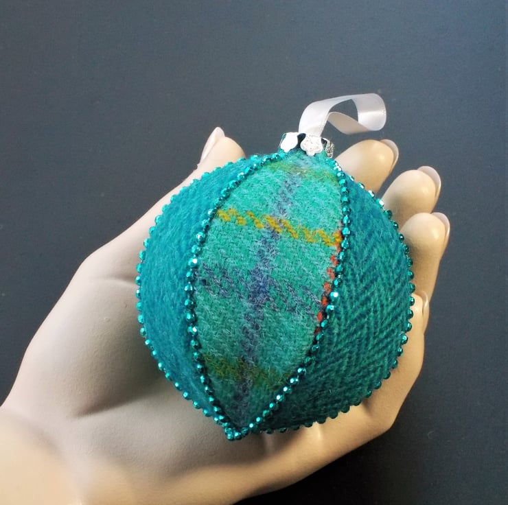 I have created this lovely bauble with six segments of fabric, alternating teal and turquoise herringbone with turquoise tartan. Each shaped piece is hand-stitched together to make the 3D shape. Then I have decorated the segment seams with turquoise bead ribbon, also hand-stitched into place. The hanging ribbon and metal clasp top are finishing details.