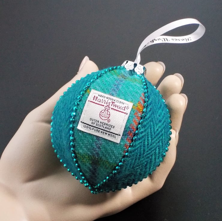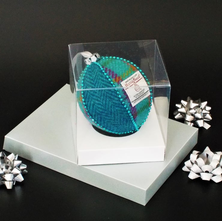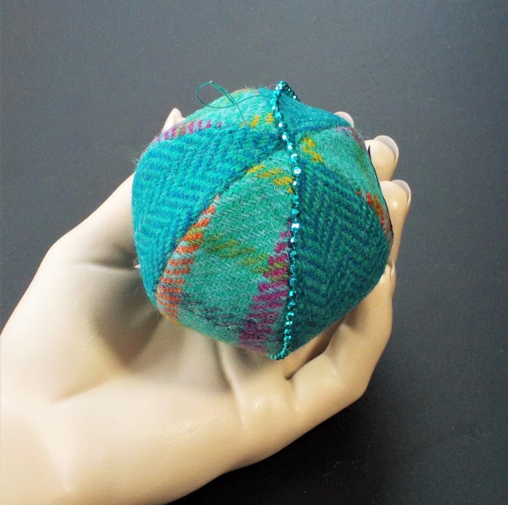 Luxury heirloom Christmas tree decoration handmade from Harris tweed hand-woven fabric in teal and turquoise. It is approx. 8.5cm in diameter and comes complete with a silver satin ribbon hanging loop. The "Orb" label, your guarantee of genuine Harris tweed is proudly displayed.