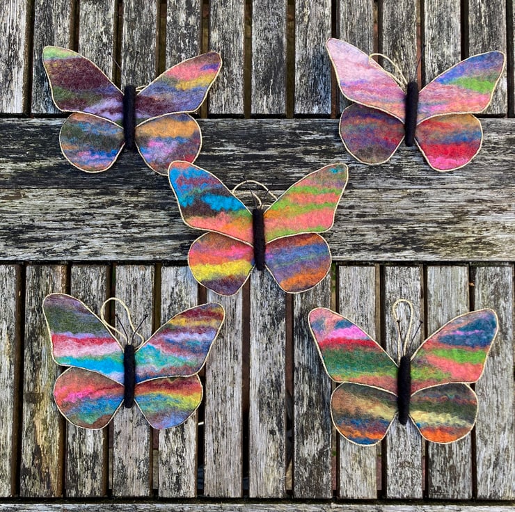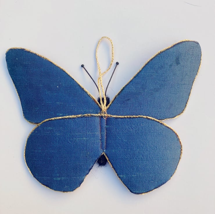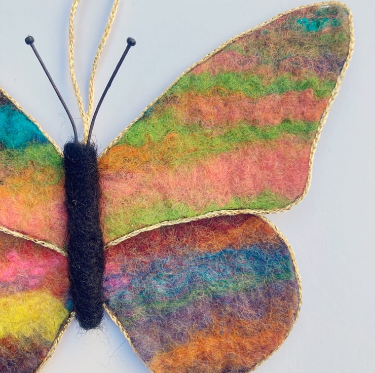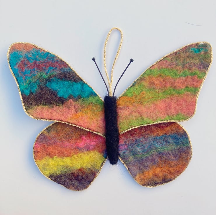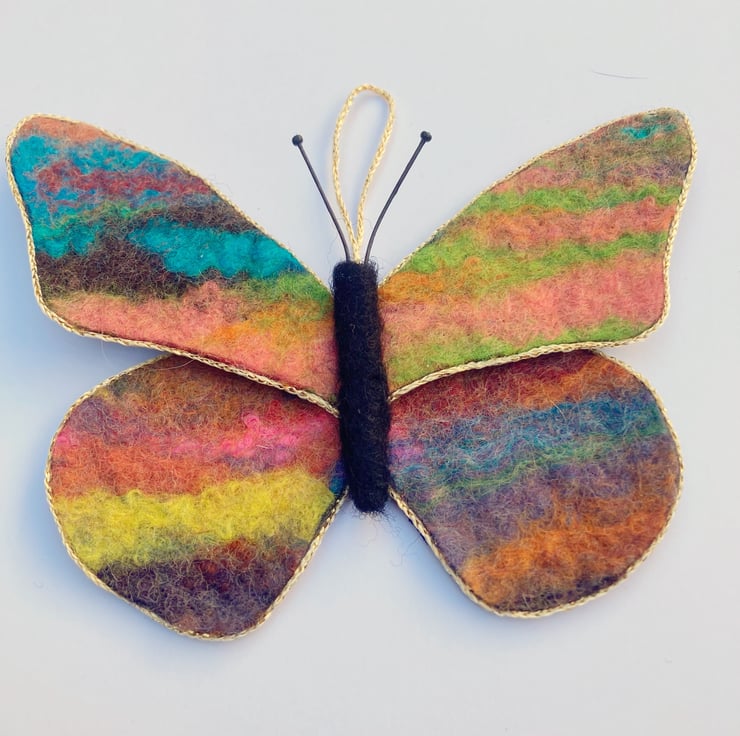A bright, colourful butterfly to hang in your home. This butterfly has been made using piece of hand made felt, wet felted from woollen fibres. The butterfly formed from the resulting felt sheet which has been backed with blue silk fabric. The wings have been edged with a thin golden cord trim. A black needle felted body and wire antennae tipped with tiny beads have been added and a short hanging thread attached. The butterfly measures approximately 13cm x 10cm.