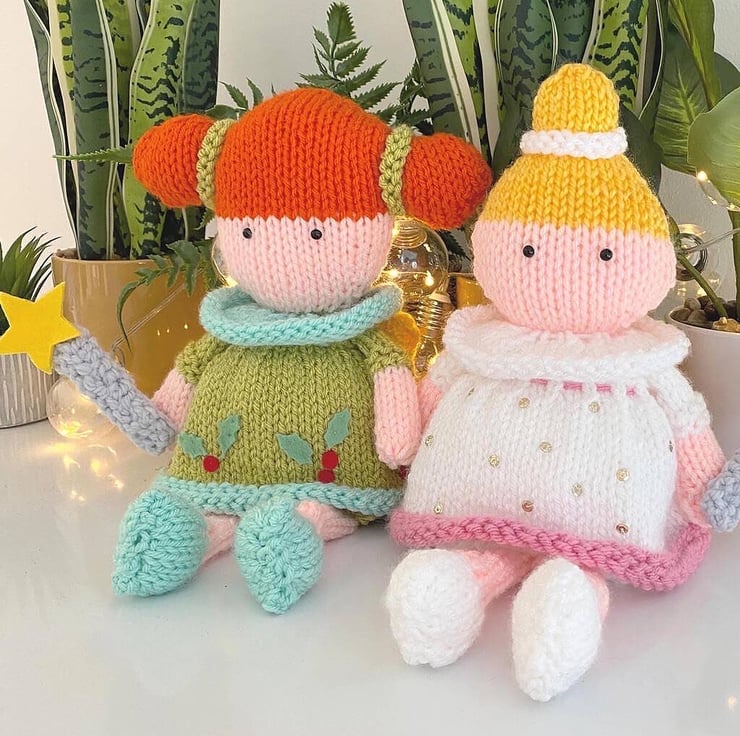 This listing is for two downloadable knitting patterns in one: knit and decorate a Winter Fairy in green and a traditional Christmas Angel doll in a white dress. Both dolls have cute wings on their backs and each holds a wand- they would make a lovely Christmas present for children.