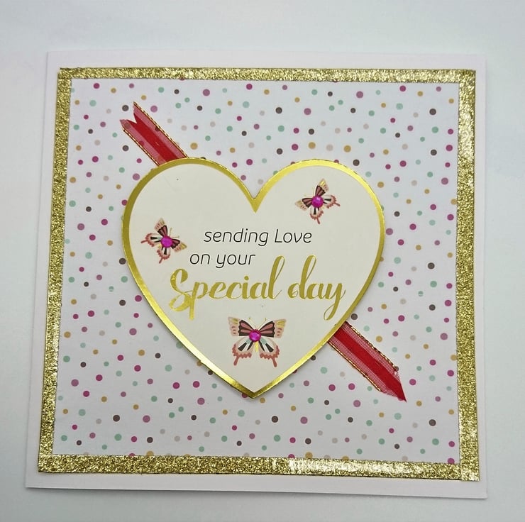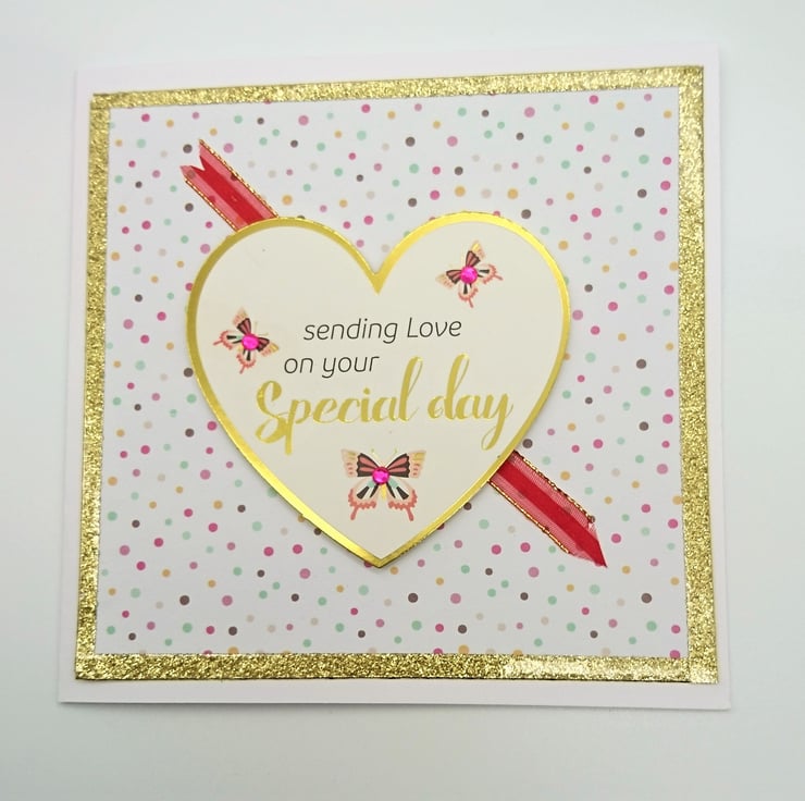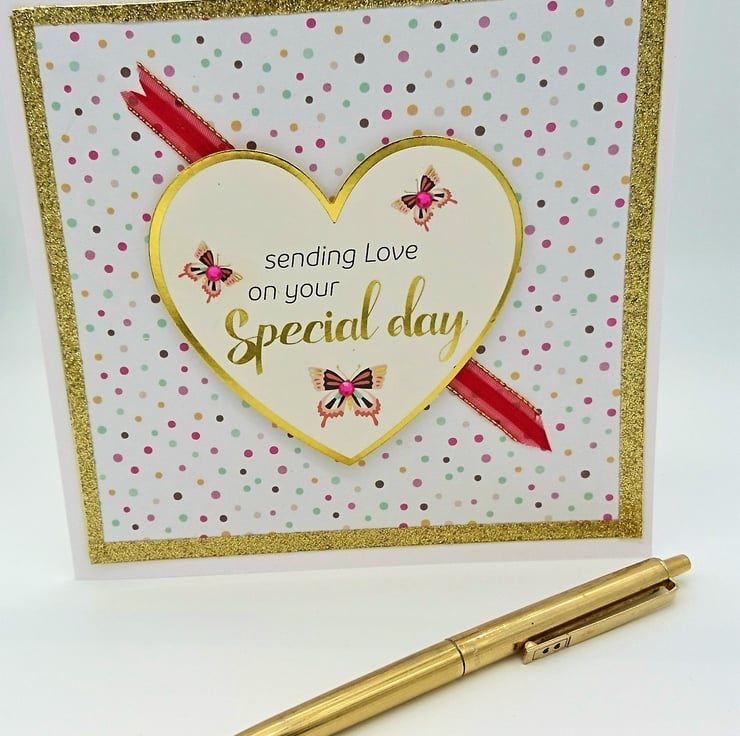 DESIGN: Top quality white card layered with multicoloured polka dot paper, bordered in gold, with raised heart topper over red and gold arrow ribbon, plus matching red gems in centre of each butterfly.