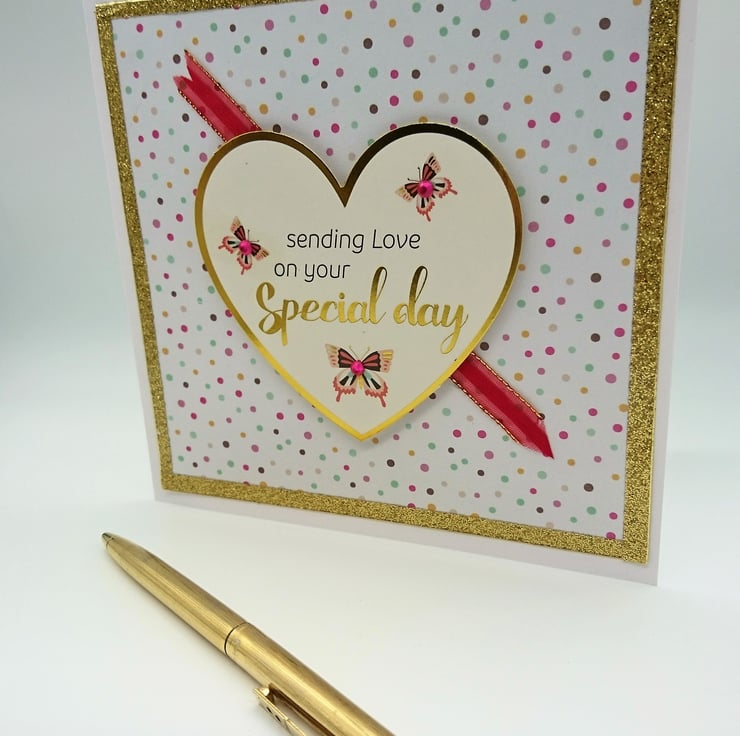 "Sending Love on your Special Day" A card for Any Special Occasion. Wedding, Engagement, Anniversary or notable celebration. Handmade with love, in my wee studio in Argyll, Scotland.
