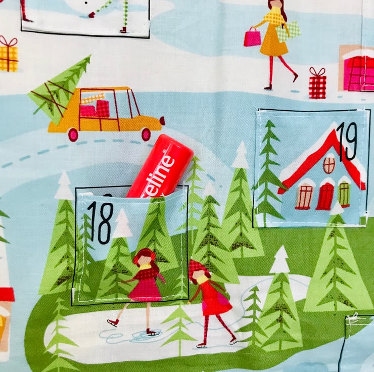 A beautiful hand made fabric advent calendar, picturing a winter scene for you to fill with your own treats.