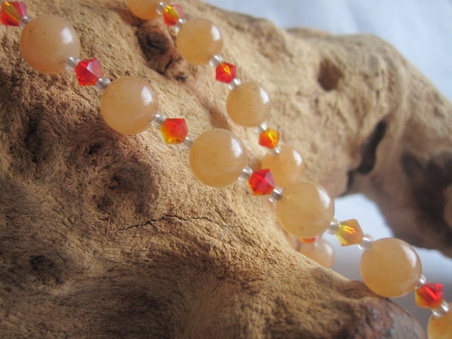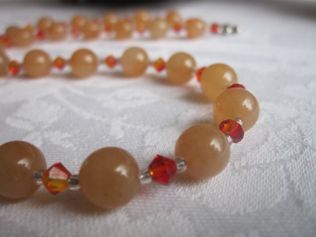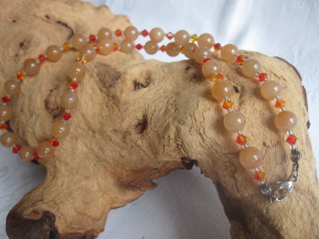 A lovely gemstone necklace made using round red Aventurine beads, Austrian crystal bicones in 2 shades of orange and silver lined clear glass seed beads. It has sterling silver findings and a trigger clasp fitting. It is approx. 18.5 inches in length and will come in an organza bag.