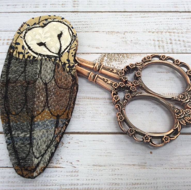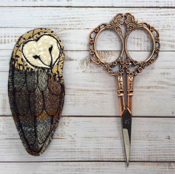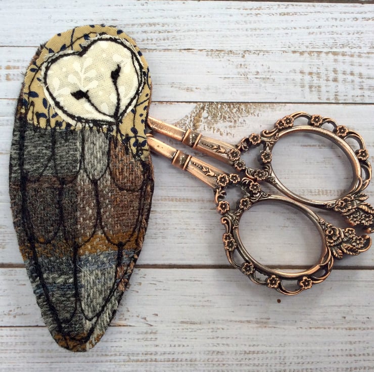This unique embroidered barn owl brooch pin or badge has been made with up-cycled fabrics and enhanced with free motion embroidery details. The brooch measures 4 x 9cm approx. Its felt backed and has a brooch pin with a safety catch on the reverse to keep it nice and secure.