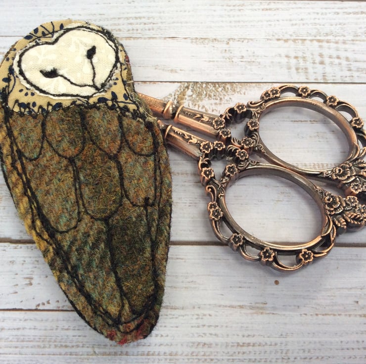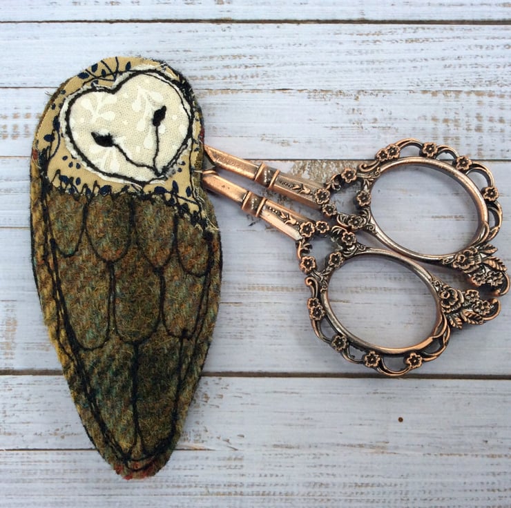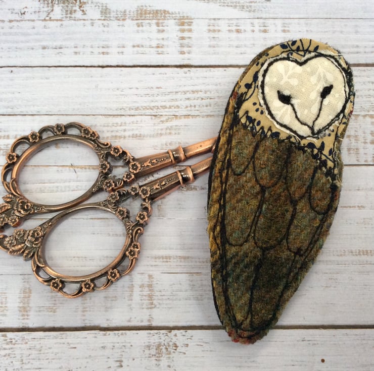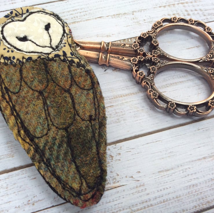 This unique embroidered barn owl brooch pin or badge has been made with up-cycled fabrics and enhanced with free motion embroidery details. The brooch measures 4 x 9cm approx. Its felt backed and has a brooch pin with a safety catch on the reverse to keep it nice and secure.