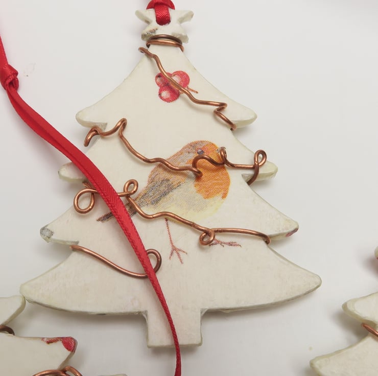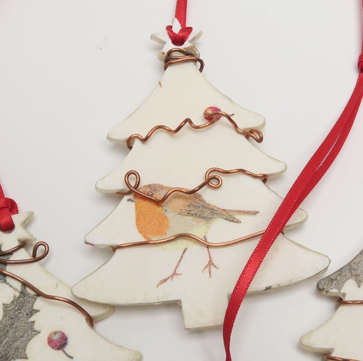 Wooden decoupaged Christmas decoration, which has been decorated with robin designs. The tree is double sided, with robins on both sides.