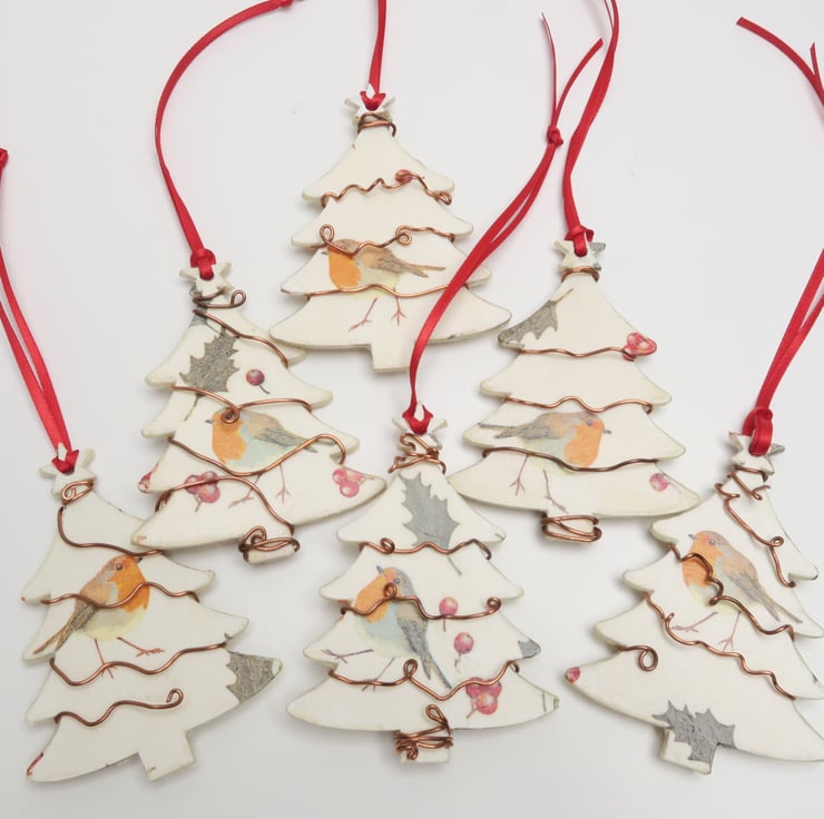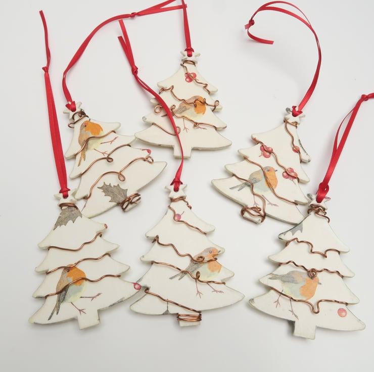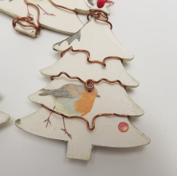 Wooden decoupaged Christmas decoration, which has been decorated with robin designs. The tree is double sided, with robins on both sides.