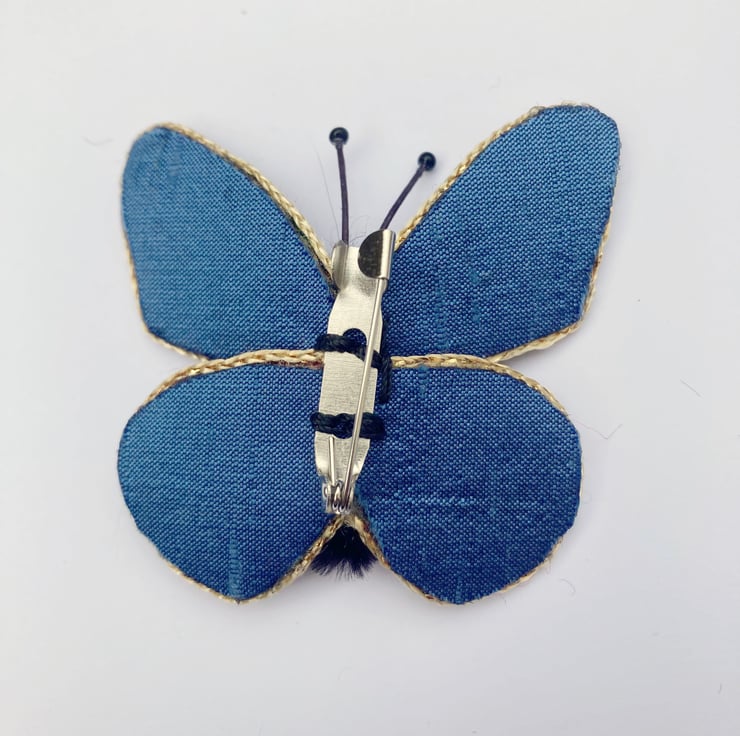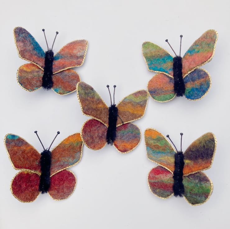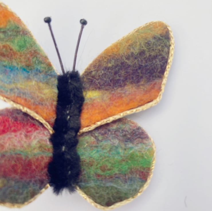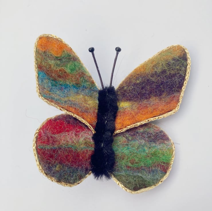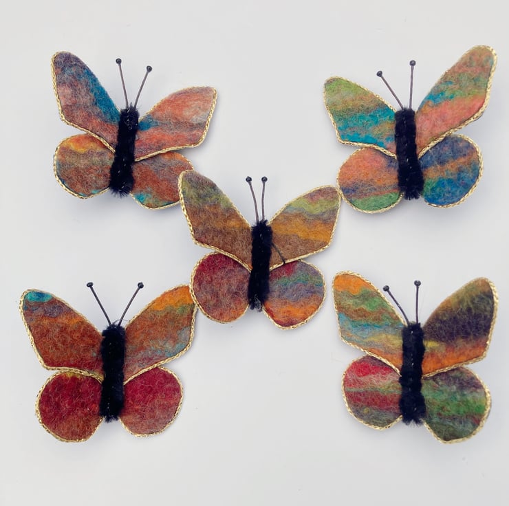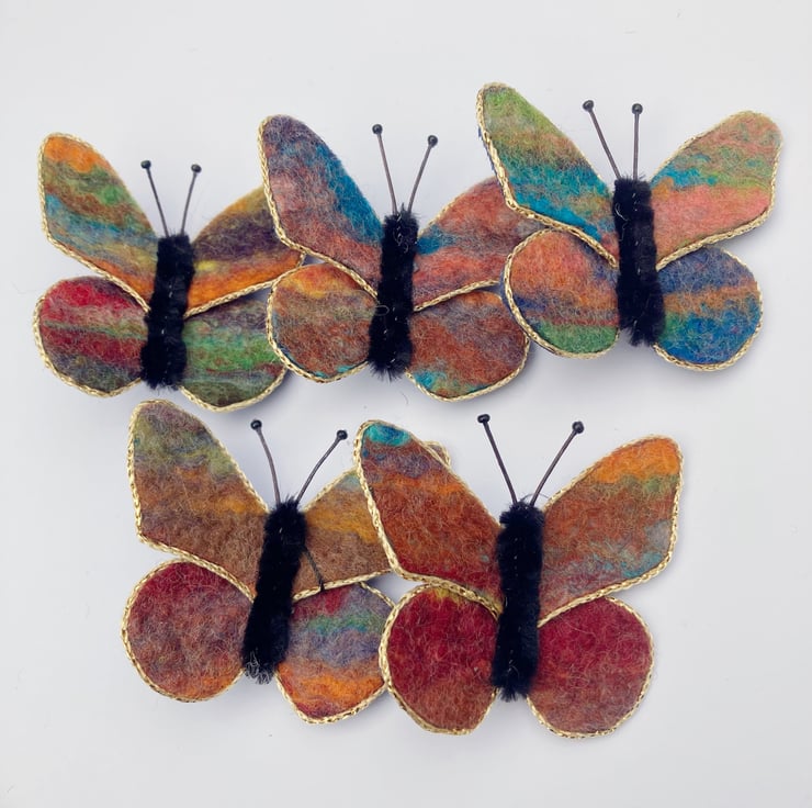 These felt butterfly brooches have been made using a piece of hand made felt. The felt has been made using merino wool fibres in lots of different colours which have been wet felted. Pieces of the resulting felt have then been backed with blue silk fabric and cut to form a pretty butterfly. The wings are outlined with gold thread and a black body and wire antennae added. The brooch is finished with a silver tone brooch pin on the reverse.
