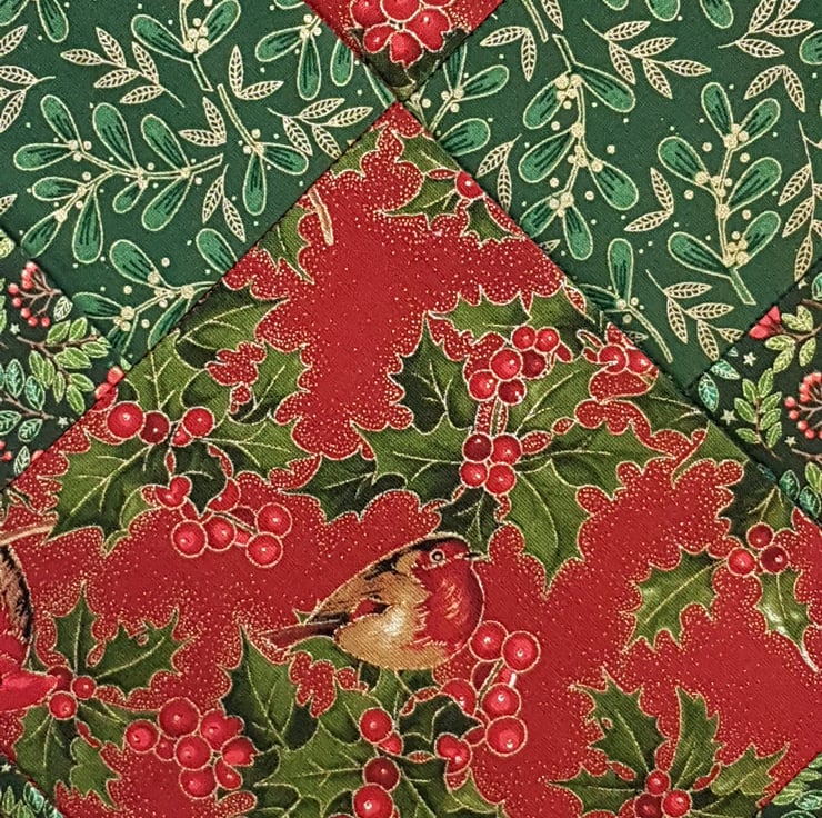 Beautiful handrafted patchwork Christmas table runner from stunning cardinal and robin birds patterned fabrics on burgundy red background. The patter are also contents berries and mistletoes on dark green with golden metallic details. Perfect for decorating the Christmas table or Christmas gift for someone. Dimensions: lenght 82cm, width:28cm