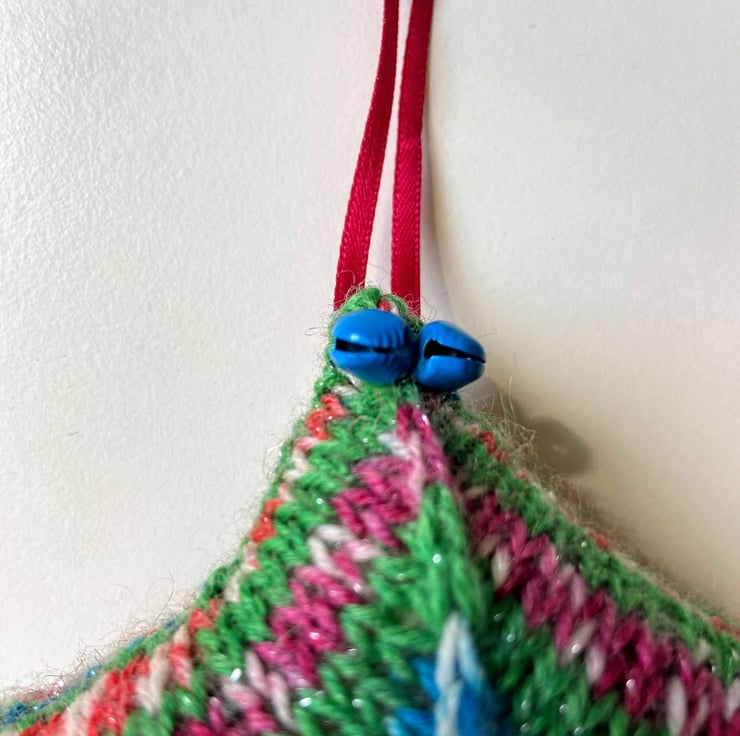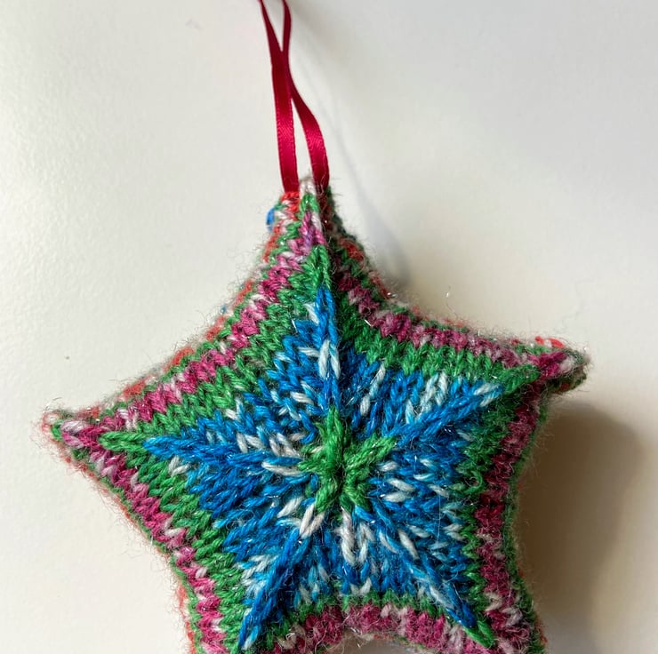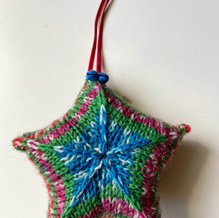 This is a lovely little 5 pointed star, knitted in multicoloured yarn which has a sparkly thread running through it and stuffed with toy grade wool stuffing which conforms to EN71, BS1425, BS5852. The star is finished with two blue coloured jingle bells and dark pink ribbon to hang.