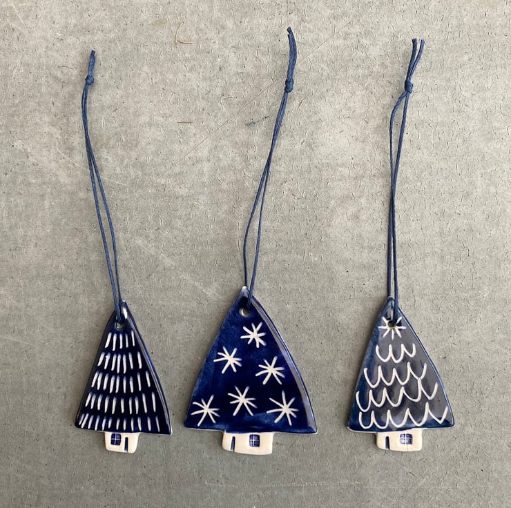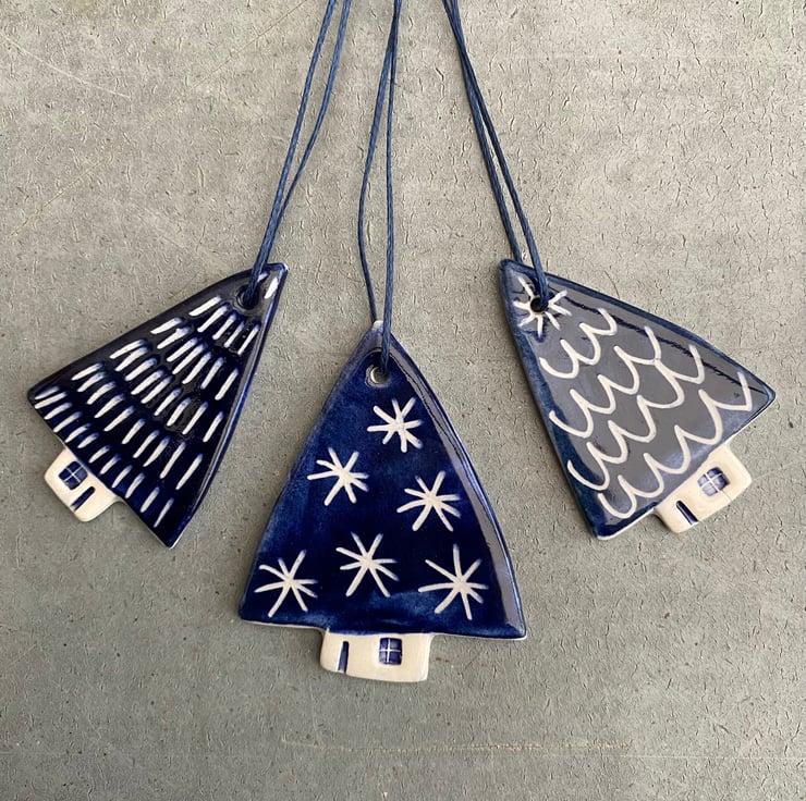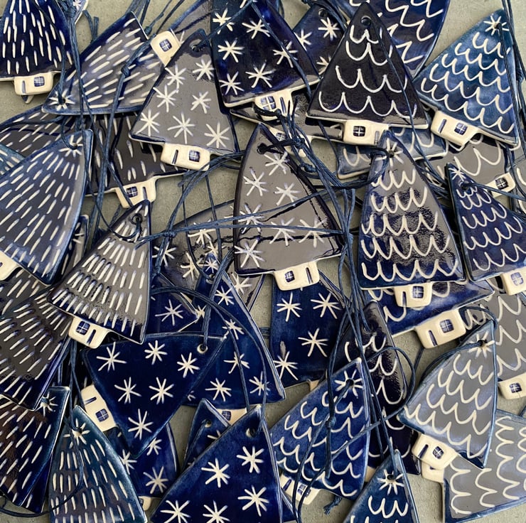 Each decoration is hand made from white earthenware clay, decorated with coloured slips and a hand drawn scraffito design. Navy cotton thread is attached to allow the decorations to be hung.