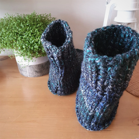 My daughter has perpetually cold feet during the winter months, so I knitted her a pair of these and they worked an absolute treat so I figured we shouldn’t just keep them to ourselves! They’ve been hand knitted with a lovely super cosy, double stranded chunky yarn in a 100% premium acrylic yarn which is predometory black with flecks of teal, blue and silver, giving it a tweed effect. Really thick, soft and cosy.