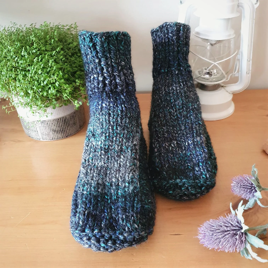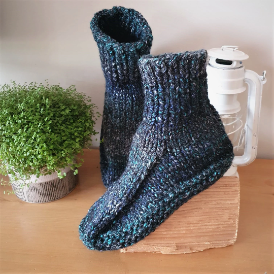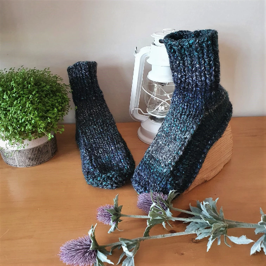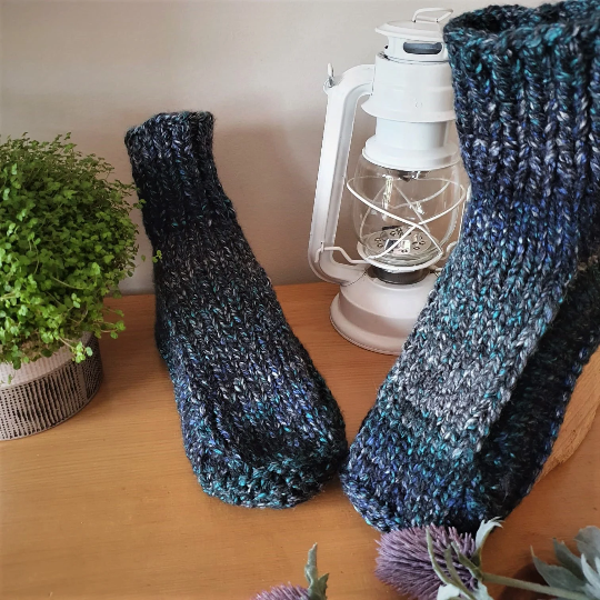 My daughter has perpetually cold feet during the winter months, so I knitted her a pair of these and they worked an absolute treat so I figured we shouldn’t just keep them to ourselves! They’ve been hand knitted with a lovely super cosy, double stranded chunky yarn in a 100% premium acrylic yarn which is predometory black with flecks of teal, blue and silver, giving it a tweed effect. Really thick, soft and cosy.